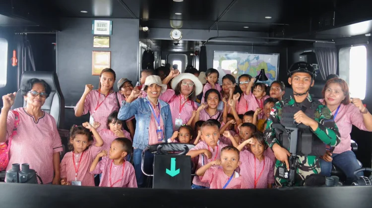 Dengan bahasa sederhana, para pendamping menjelaskan fungsi kapal perang dalam menjaga kedaulatan laut Indonesia. Anak-anak juga diperkenalkan pada peran prajurit TNI AL dalam melindungi wilayah perairan nasional.