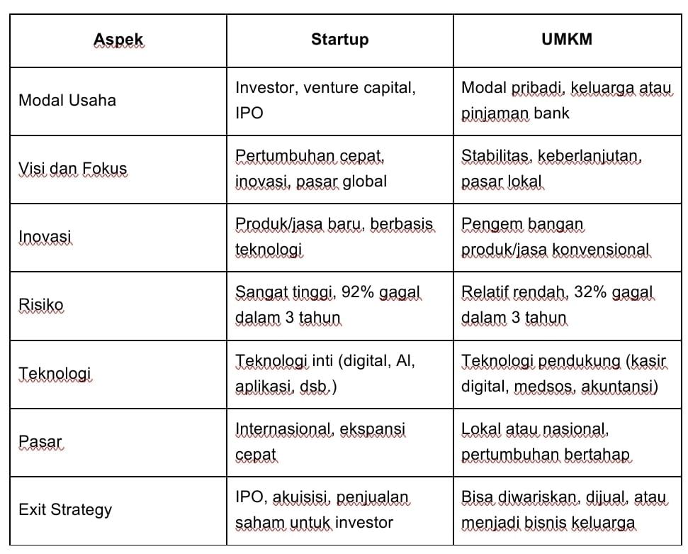 - Visi Bisnis: Startup mengejar pertumbuhan eksponensial, UMKM berfokus pada keberlanjutan jangka panjang.