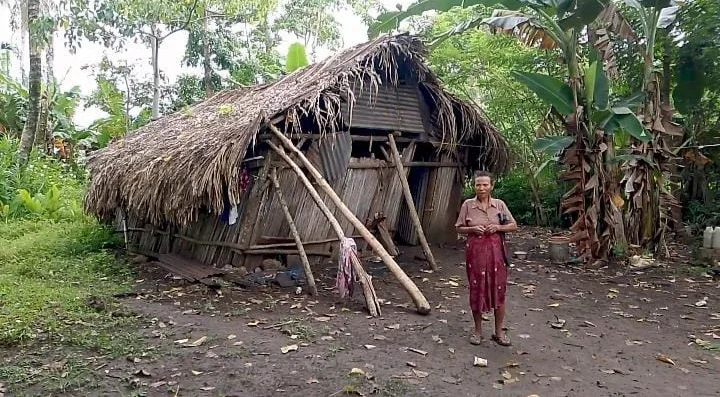 RRI.CO.ID, Malaka - Yosefin Abuk (65) bersama anak tinggal di gubuk tua nyaris roboh di Desa Beiudukfoho, Kecamatan Rinhat, Kabupaten Malaka. Senin 9 Maret 2026.