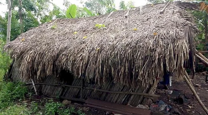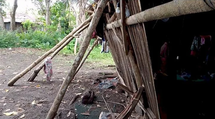 Atap daun gewang bocor, dinding pelepah lapuk dan tiang miring membuat rumah itu membahayakan penghuninya.