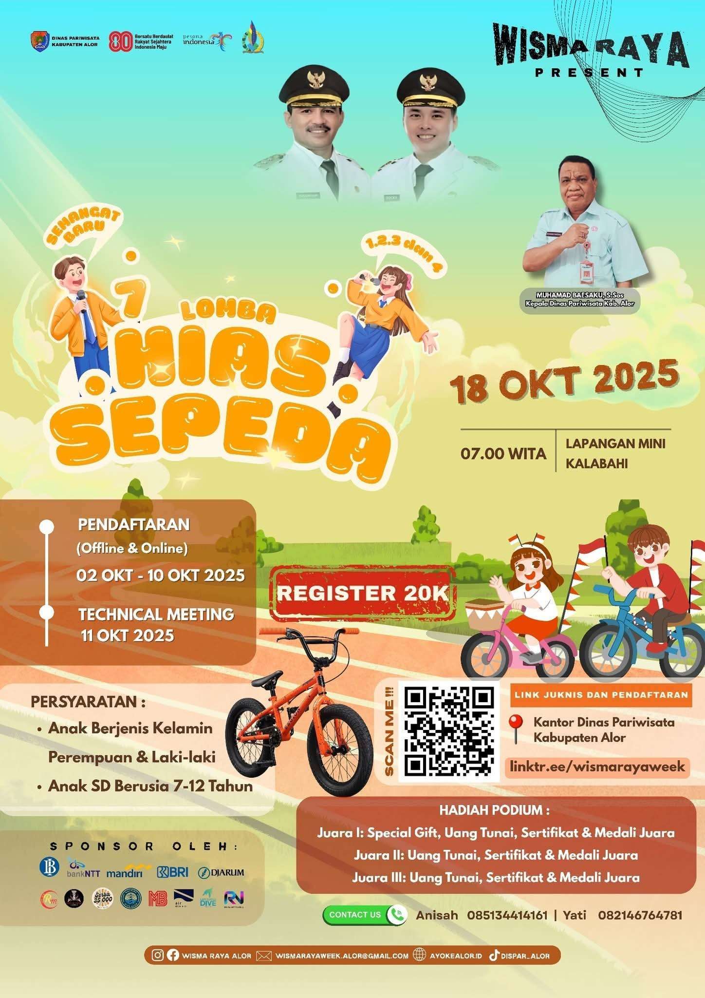 KBRN, Alor: Sebagai salah satu kegiatan meriah dalam rangkaian Wisma Raya 2025, Kabupaten Alor akan menggelar Lomba Hias Sepeda pada 18 Oktober 2025. Acara ini dijadwalkan berlangsung mulai pukul 07.00 WITA di Lapangan Mini Kalabahi.