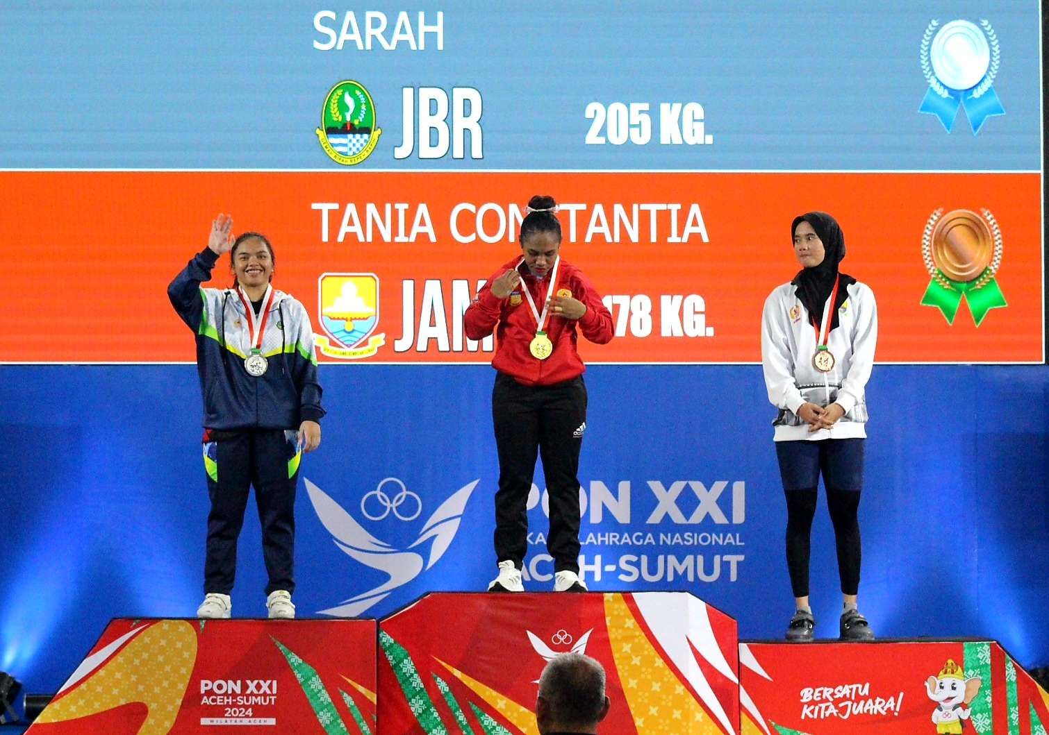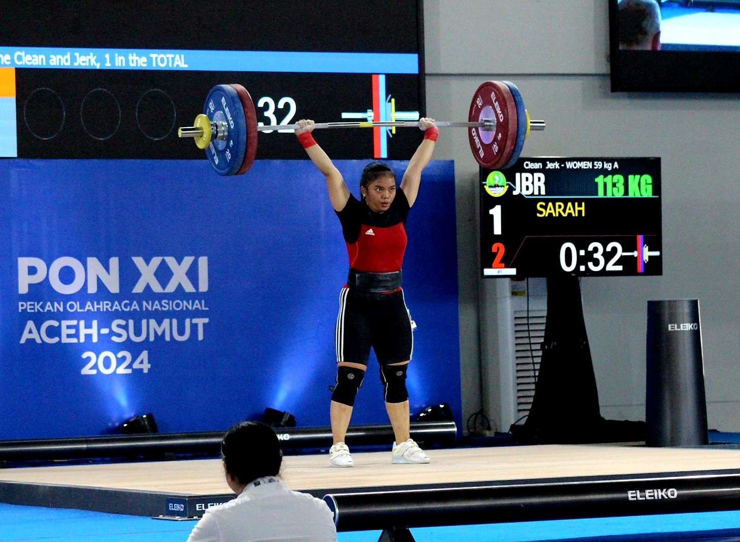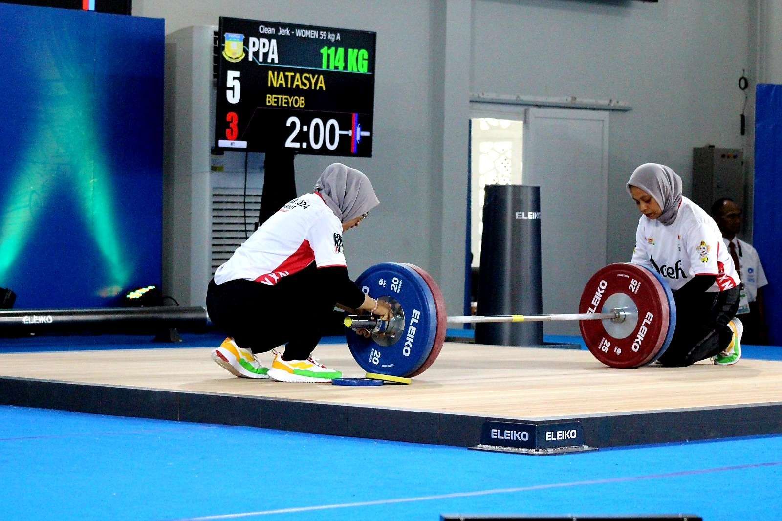 Sementara medali perak disabet oleh Sarah, lifter asal Jawa Barat yang membukukan total angkatan 205 kilogram dengan rincian snatch 92 kilogram dan clean and jerk 113 kilogram. Sedangkan posisi ketiga diraih oleh Lifter Jambi Tania Constantia dengan angkatan total 178 kilogram dengan snatch 78 kilogram dan clean and jerk 100 kilogram. Foto : RRI/Munjir