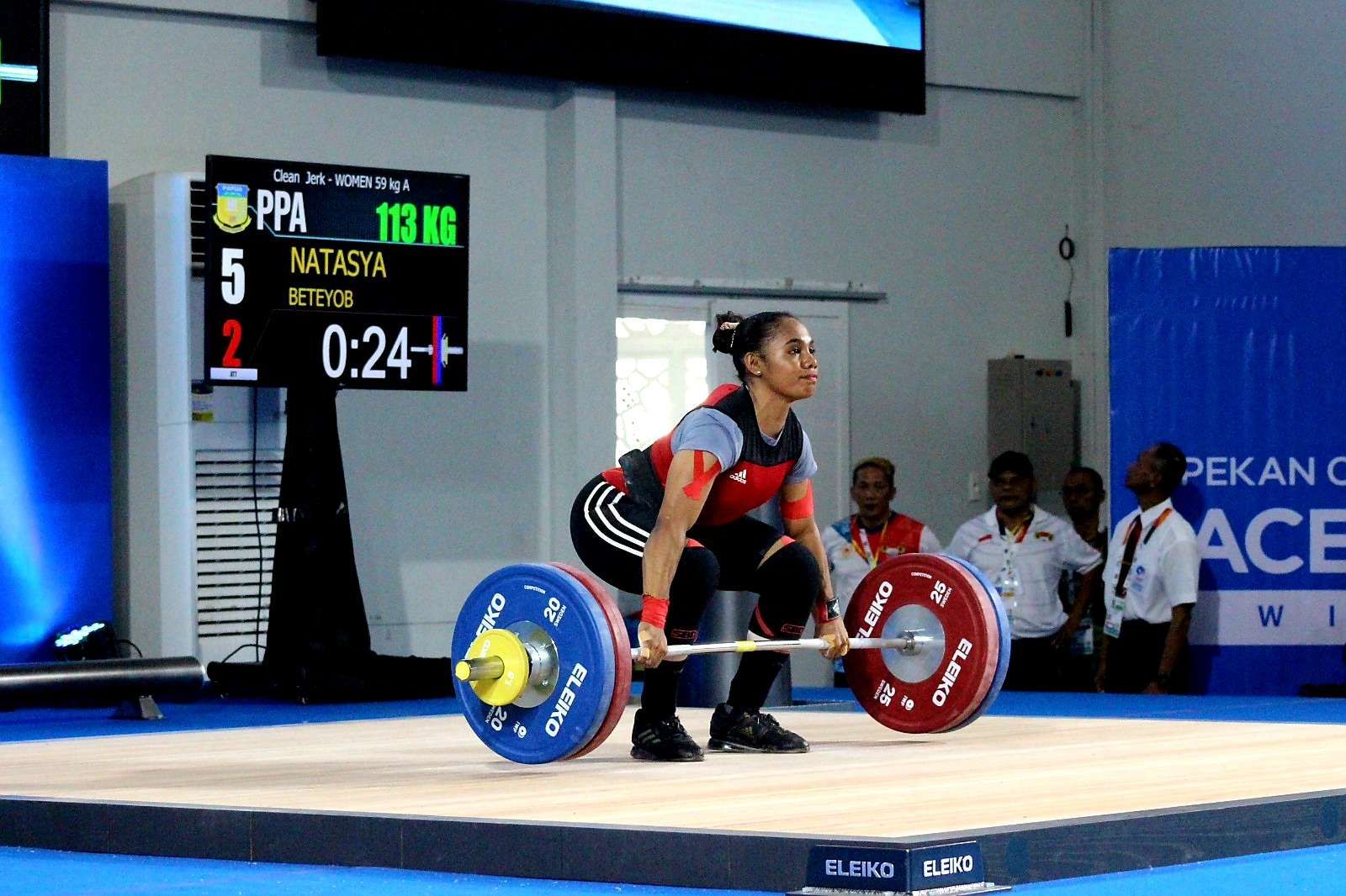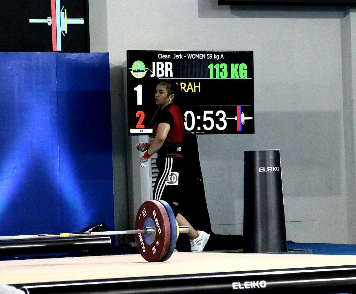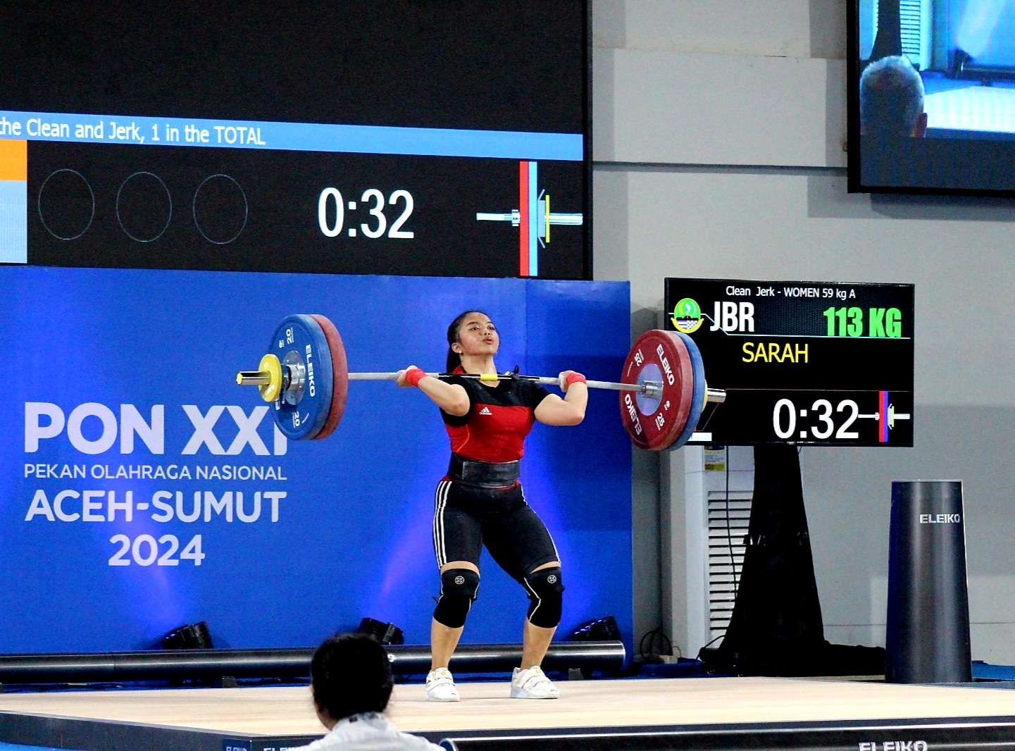 Sementara medali perak disabet oleh Sarah, lifter asal Jawa Barat yang membukukan total angkatan 205 kilogram dengan rincian snatch 92 kilogram dan clean and jerk 113 kilogram. Sedangkan posisi ketiga diraih oleh Lifter Jambi Tania Constantia dengan angkatan total 178 kilogram dengan snatch 78 kilogram dan clean and jerk 100 kilogram. Foto : RRI/Munjir