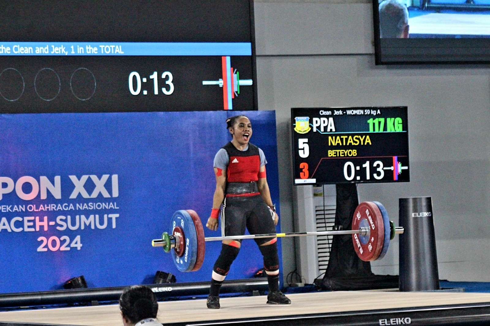KBRN, Banda Aceh : Natasya Beteyob, lifter asal Papua, merayakan kemenangan usai menyumbang medali emas ketiga untuk kontingennya di Pekan Olahraga Nasional (PON) XXI Aceh-Sumut 2024 yang berlangsung di Seuramo Angkat Besi Harapan Bangsa, Banda Aceh, Jumat (6/9/2024).