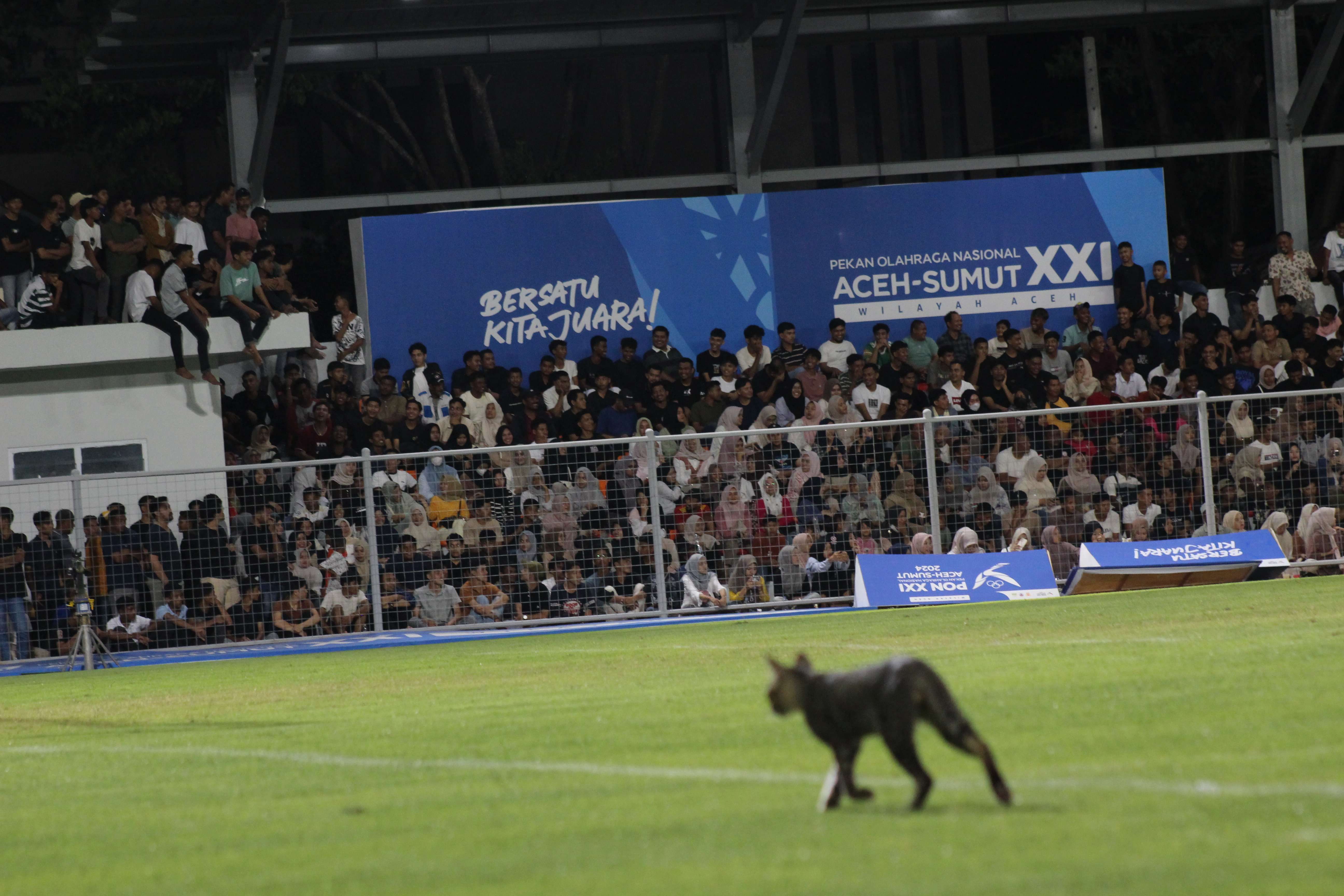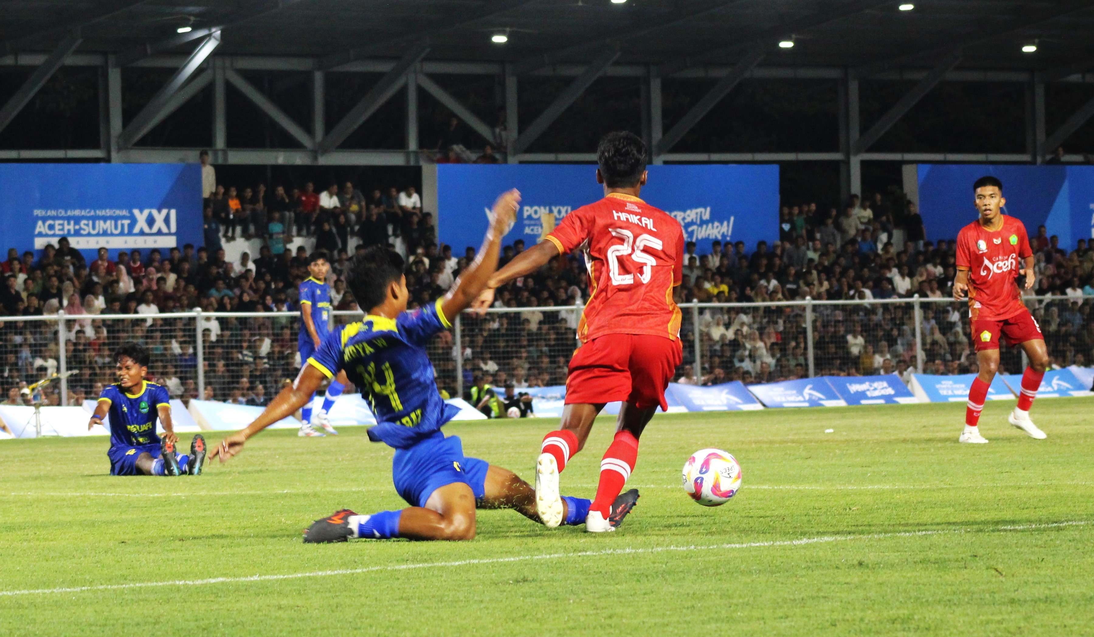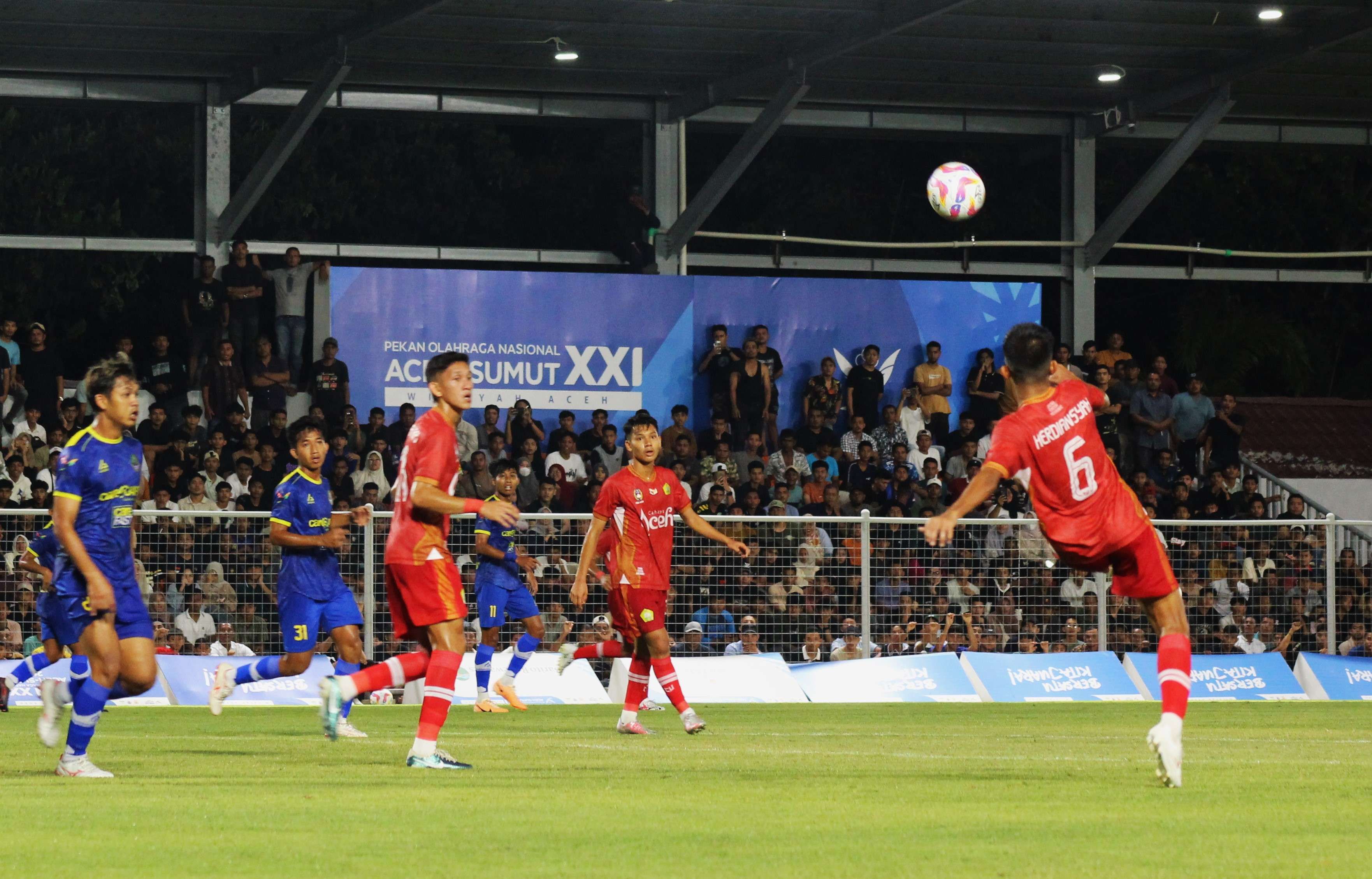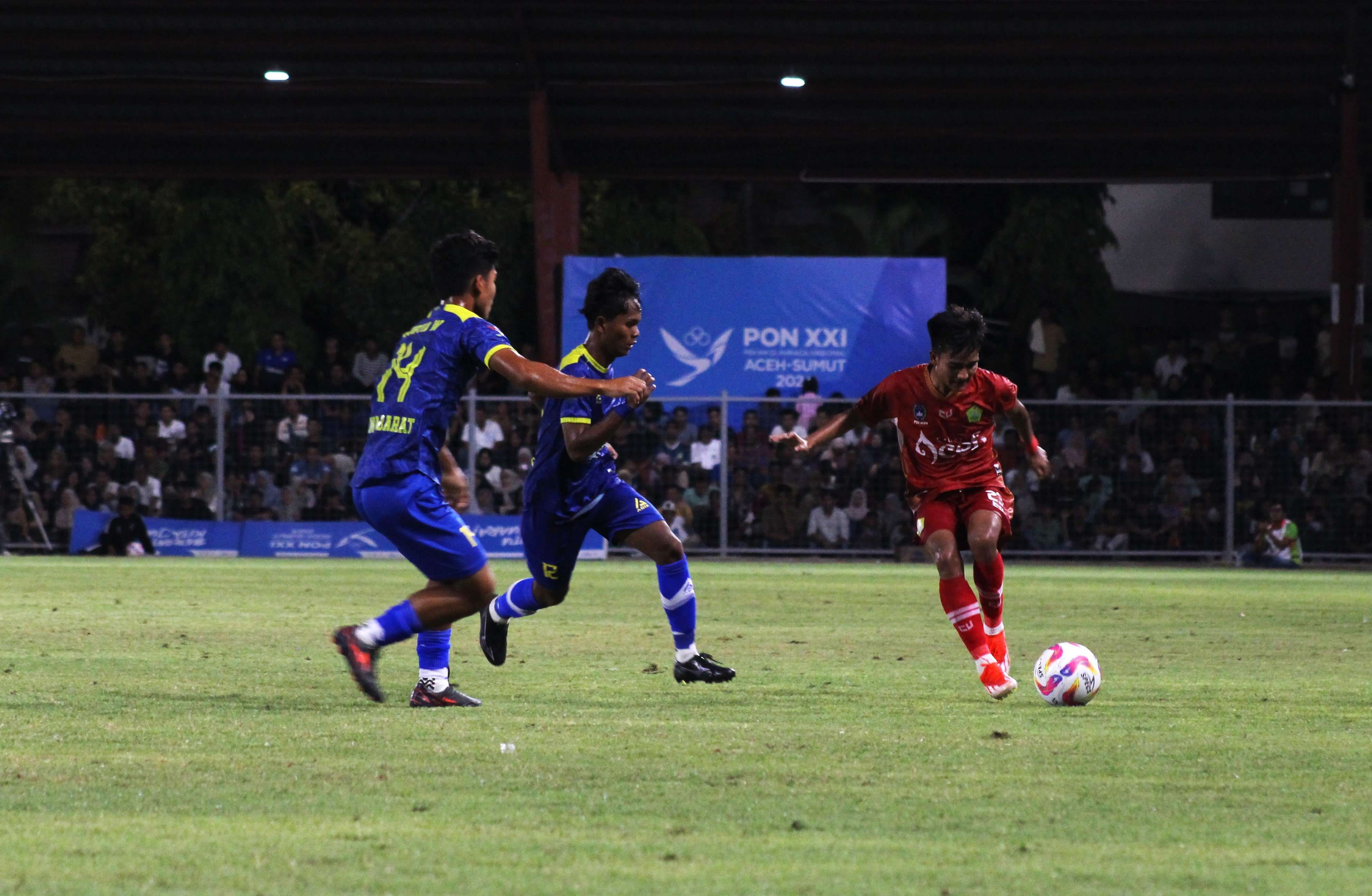 KBRN, Banda Aceh : Tim Aceh melakoni laga pamungkas pada grup A cabang olahraga sepak bola putra Pekan Olahraga Nasional (PON) XXI Aceh-Sumut 2024 berhadapan dengan tim Jawa Barat di Stadion H. Dimurthala Lampineung Banda Aceh, Selasa (10/9/2204) malam. Dalam laga penentuan juara grup ini, Aceh menang atas Jawa Barat dengan skor 2-1 sekaligus mengamankan tiket ke 8 besar. Foto : Munjir/RRI