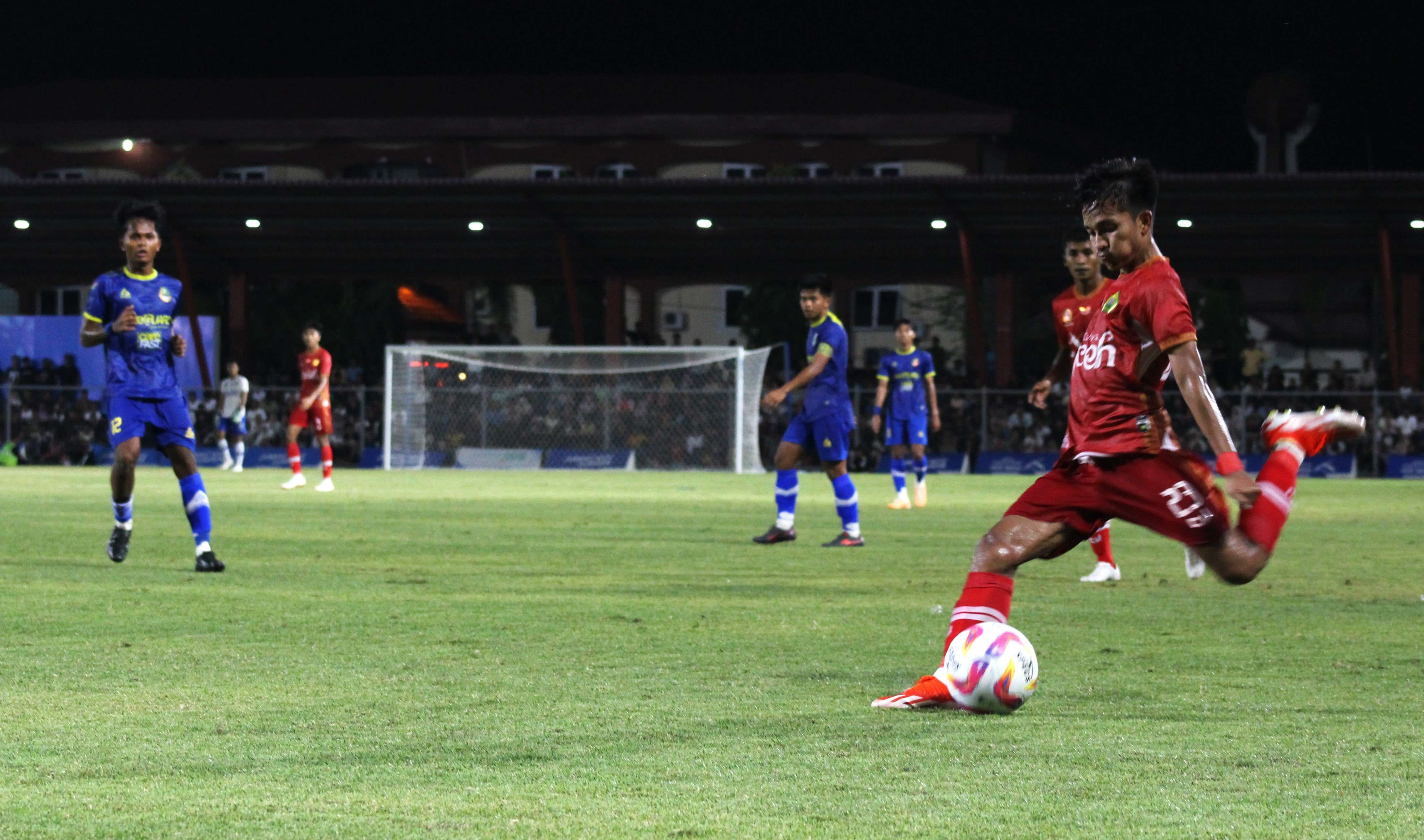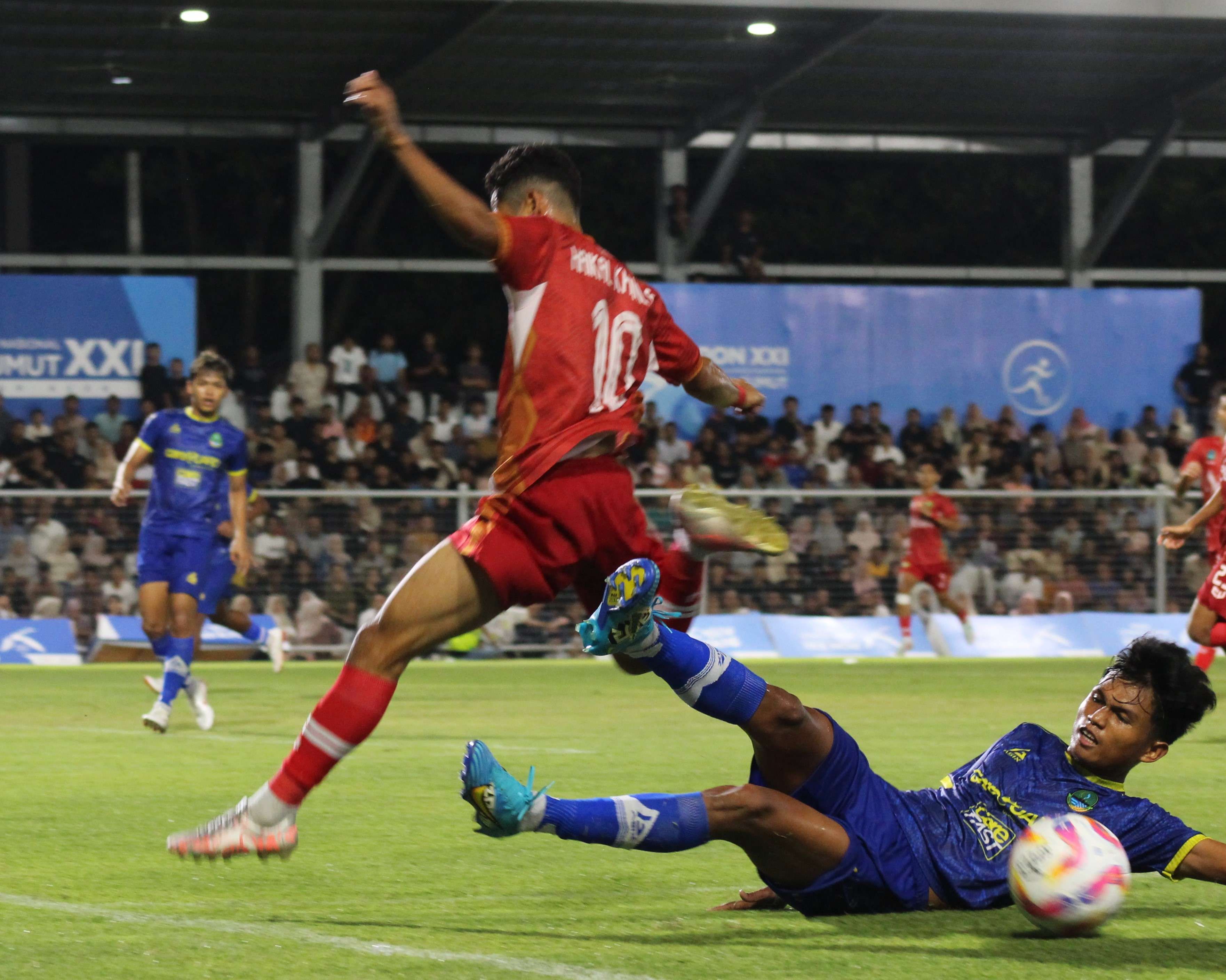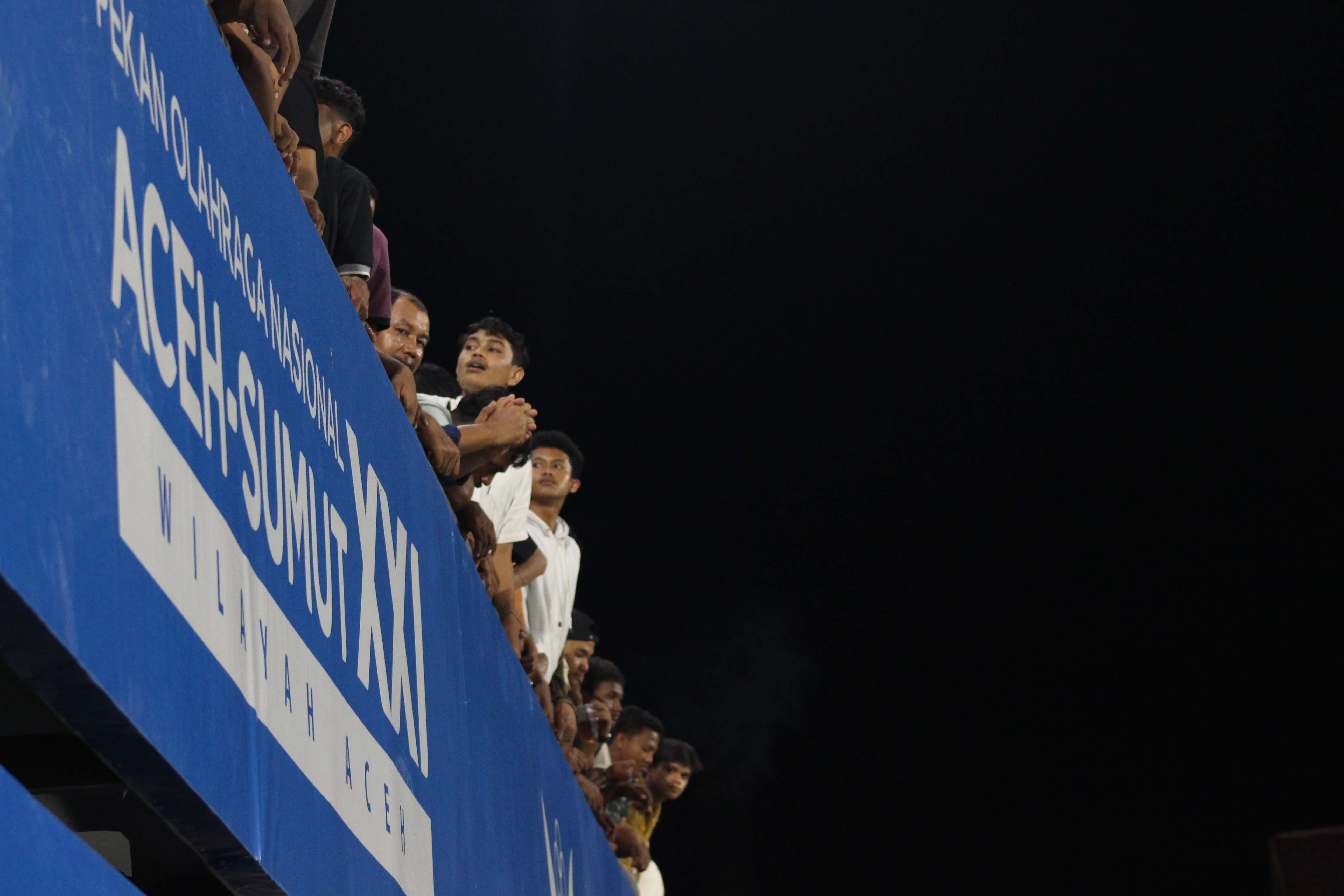 KBRN, Banda Aceh : Tim Aceh melakoni laga pamungkas pada grup A cabang olahraga sepak bola putra Pekan Olahraga Nasional (PON) XXI Aceh-Sumut 2024 berhadapan dengan tim Jawa Barat di Stadion H. Dimurthala Lampineung Banda Aceh, Selasa (10/9/2204) malam. Dalam laga penentuan juara grup ini, Aceh menang atas Jawa Barat dengan skor 2-1 sekaligus mengamankan tiket ke 8 besar. Foto : Munjir/RRI