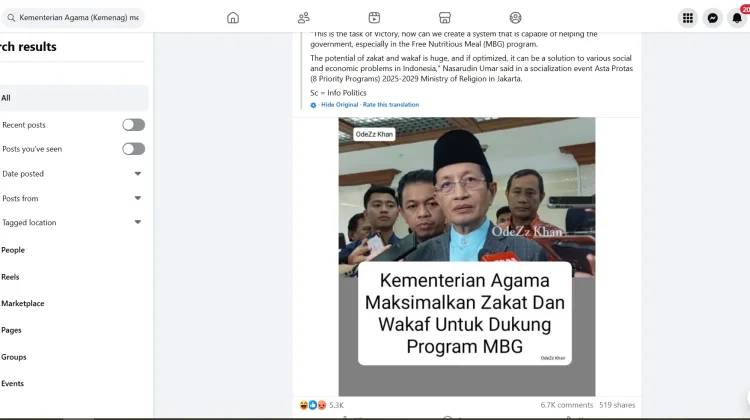 RRI.CO.ID, Banda Aceh - Beredar unggahan di Facebook yang mengeklaim Kementerian Agama memaksimalkan zakat dan wakaf untuk mendukung program Makan Bergizi Nasional. Informasi tersebut tersebar luas melalui sejumlah akun dan grup media sosial.
