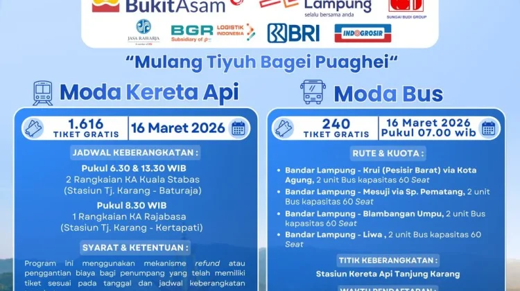 RRI.CO.ID, Bandarlampung - Pemerintah Provinsi Lampung melalui Dinas Perhubungan kembali menggelar program mudik gratis pada Lebaran 2026. Program ini menyediakan moda transportasi kereta api dan bus bagi masyarakat yang ingin pulang ke kampung halaman. Keberangkatan dijadwalkan berlangsung Senin, 16 Maret 2026 dari Stasiun Tanjung Karang.