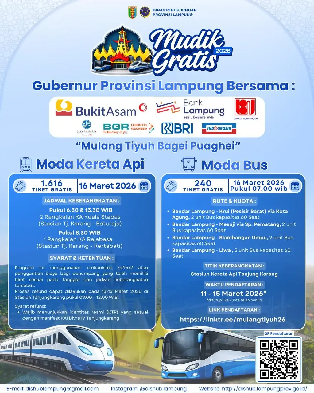 Masyarakat yang ingin mengikuti program ini dapat melakukan pendaftaran secara daring. Pendaftaran dibuka melalui tautan https://linktr.ee/mulangtiyuh26. Pemerintah berharap program ini membantu masyarakat mudik lebih aman, nyaman, dan hemat menjelang Hari Raya Idul Fitri 1447 Hijriah.