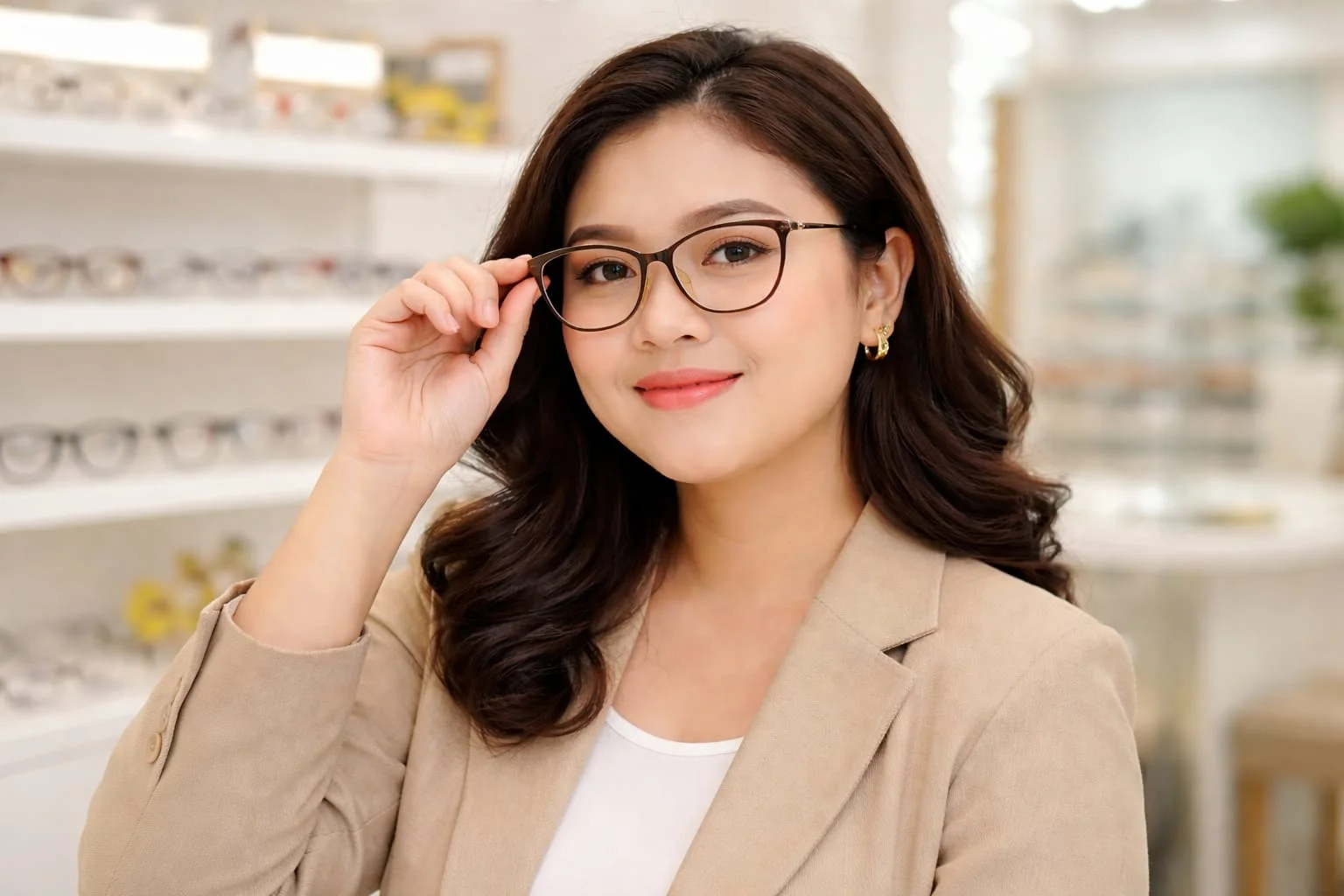 Kalau ingin tampil lebih stylish dan standout, bingkai cat-eye bisa jadi pilihan tepat. Ujung bingkai yang terangkat ke atas membantu menarik fokus ke area mata sekaligus memberi efek wajah tampak lebih terangkat. Model ini cocok untuk kamu yang ingin menonjolkan kesan elegan dan berkelas.