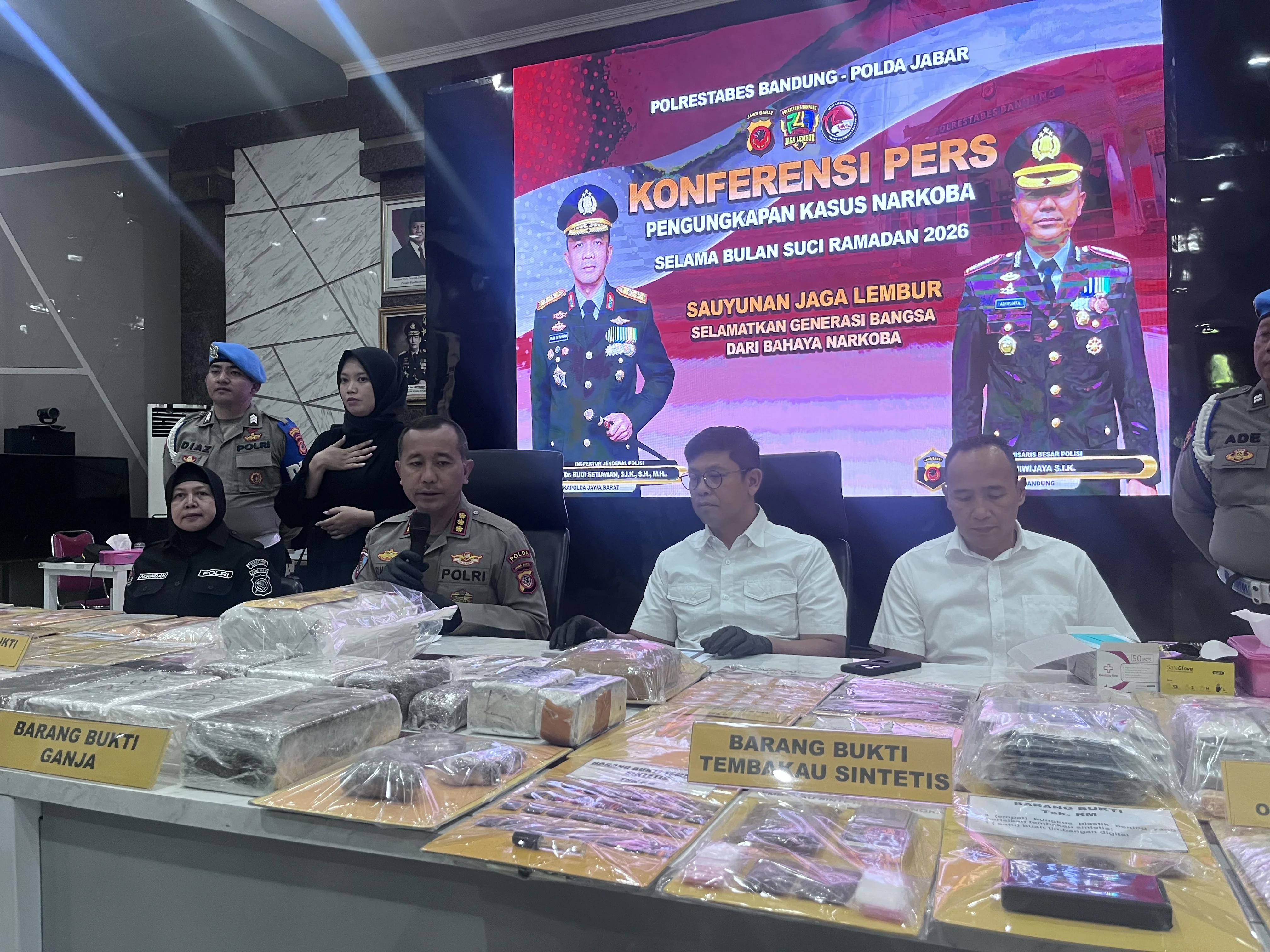 “Untuk ganja sekitar sembilan kilo kita ungkap di daerah Bojongkoneng, Bandung. Barang tersebut berasal dari daerah Sumatera dan dikirim melalui jalur darat,” kata Agah saat rilis kasus, di Mapolrestabes Bandung, Rabu 11 Maret 2026.