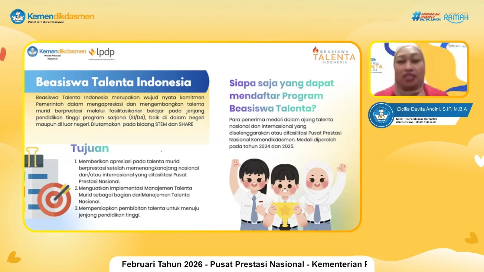 Kepala Puspresnas, Maria Veronica Irene, menjelaskan bahwa BTI jenjang S1 dan D4 tahun 2026 diperuntukkan bagi murid berprestasi pada ajang talenta yang diselenggarakan atau difasilitasi Puspresnas pada 2024 dan 2025. Program ini menjadi bentuk apresiasi sekaligus sarana pengembangan potensi peserta didik.