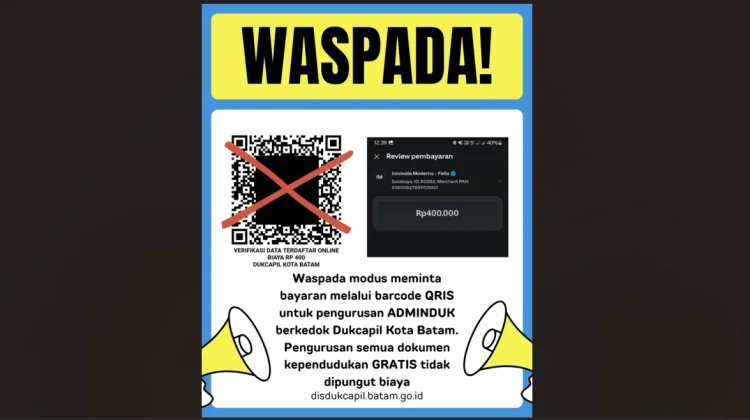 RRI.CO.ID, Batam – Dinas Kependudukan dan Pencatatan Sipil (Disdukcapil) Kota Batam mengimbau masyarakat agar waspada terhadap modus penipuan yang mengatasnamakan layanan administrasi kependudukan. Penipuan tersebut dilakukan dengan meminta masyarakat melakukan pembayaran melalui barcode QRIS dengan dalih biaya verifikasi data kependudukan.