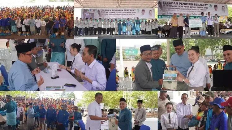 RRI.CO.ID, Batam - Semangat kepedulian di bulan suci Ramadhan kembali diwujudkan melalui kegiatan bertajuk “Teladan Pemimpin Berzakat Bersama BAZNAS Kota Batam Tahun 2026” yang digelar di Alun-Alun Pemerintah Kota Batam pada Selasa, 10 Maret 2026, bertepatan dengan 20 Ramadhan 1447 Hijriah. Kegiatan ini mengangkat tema “Zakat Menumbuhkan Keberkahan” sekaligus dirangkaikan dengan program berbagi kebahagiaan bagi penyandang disabilitas serta para petugas lapangan dari Satgas Dinas Lingkungan Hidup (DLH).
