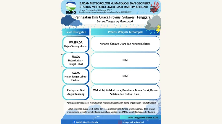 RRI.CO.ID, Baubau - Badan Meteorologi, Klimatologi dan Geofisika (BMKG) merilis peringatan dini cuaca untuk wilayah Sulawesi Tenggara (Sultra) Senin, 9 Maret 2026.