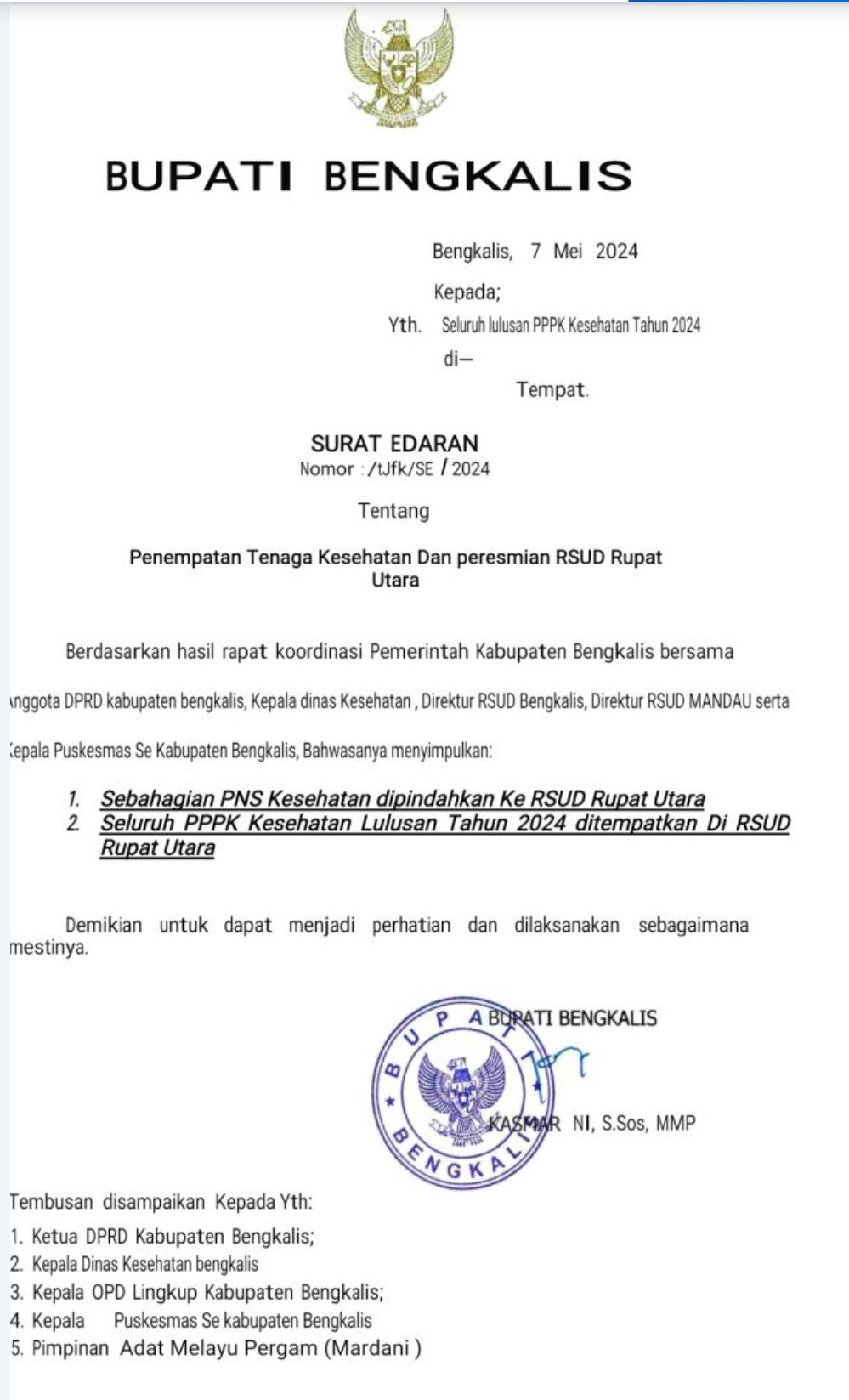 Viral surat edaran (SE) yang disebut-sebut ditandatangani oleh Bupati Bengkalis Kasmarni, terkait penempatan tenaga kesehatan dan peresmian RSUD Rupat Utara. Adapun isi SE tersebut menyatakan:
