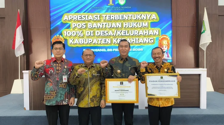 RRI.CO>ID, kepahiang - Pemerintah daerah kabupaten Kepahiang mendapatkan 2 piagam penghargaan sekaligus dari Kementerian Hukum Republik Indonesia kantor wilayah Bengkulu. Dua capaian tersebut adalah terbentuknya 100% Pos Bantuan Hukum Kelurahan dan Desa Se-kabupaten Kepahiang dan Indeks Reformasi Hukum dengan predikat AA (Istimewa).