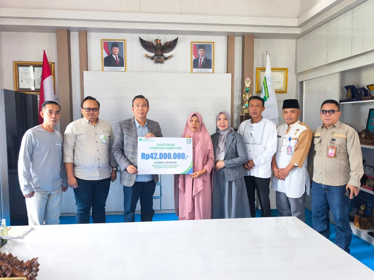 RRI.CO.ID, Bengkulu - Bupati Kepahiang H. Zurdi Nata, S.IP bersama kepala cabang BPJS Ketenagakerjaan rejang lebong Yogo Iman Kristianto menyalurkan santunan kematian kepada ahli waris dari Almarhum Syamsil Bahroni Kepala Desa Permu kecamatan Kepahiang. Jum’at (6/3/2026) di Ruang kerja Bupati Kepahiang.
