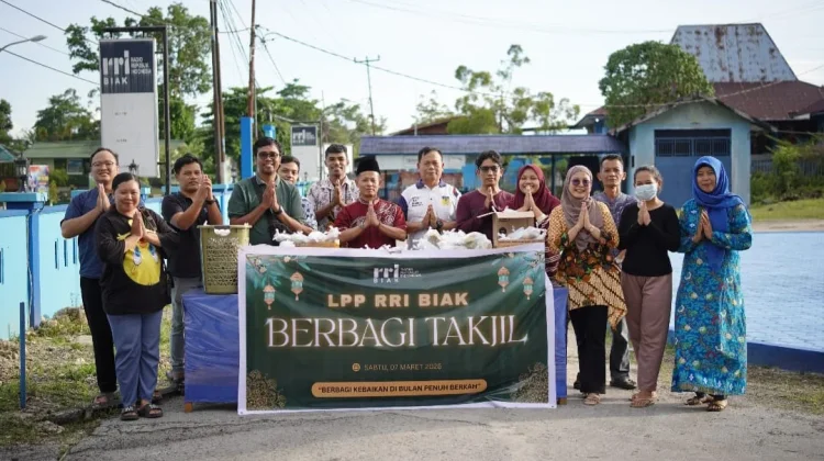 RRI.CO.ID,Biak – Dalam suasana berkah bulan Ramadan, Lembaga Penyiaran Publik (LPP) RRI Biak melakukan pembagian takjil kepada masyarakat pada Sabtu 7 Maret 2026. Kegiatan yang bertujuan menebar kebaikan dan keberkahan ini dilakukan di dua lokasi, yaitu di depan Kantor RRI Biak Jalan Majapahit dan dilanjutkan Pemberian Takjil kepada Masjid Alwasilah, Mandouw. Dengan total sebanyak 300 paket takjil yang dibagikan.