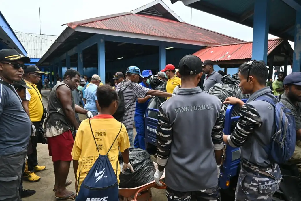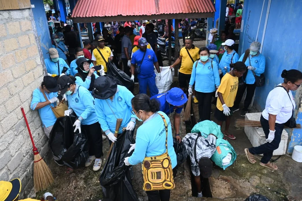 RRI.CO.ID, Biak- Bupati Biak Numfor, Markus Oktovianus Mansnembra bersama jajaran, TNI-Polri , Ketua TP PKK bersam pengurus, para relawan Trash Hero Biak dan komunitas peduli lingkungan, turun langsung dalam kegiatan bersih – bersih sampah di kawasan Pasar Bosnik, Distrik Biak Timur, Kabupaten Biak Numfor, Provinsi Papua, Sabtu 14 Maret 2026.