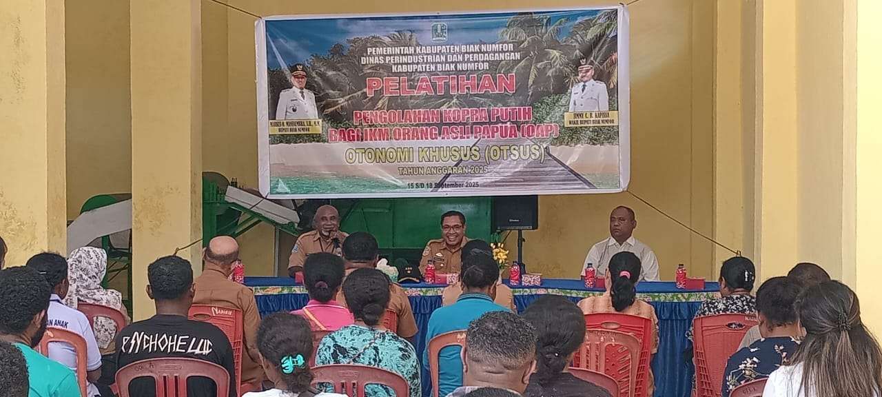 KBRN,Biak: Sebanyak lima murid SMK Negeri 3 Kamaritiman Biak Numfor mengikuti Pelatihan Pengolahan Kopra Putih bagi Industri Kecil Menengah (IKM) khusus orang asli Papua (OAP) yang diselenggarapan Pemda Biak Numfor melalui Dinas Perindustrian dan Perdagangan (Disperindag) bertempat di Kompleks Sentra Produksi Sabut Kelapa, Kampung Manswam Distrik Biak Kota.