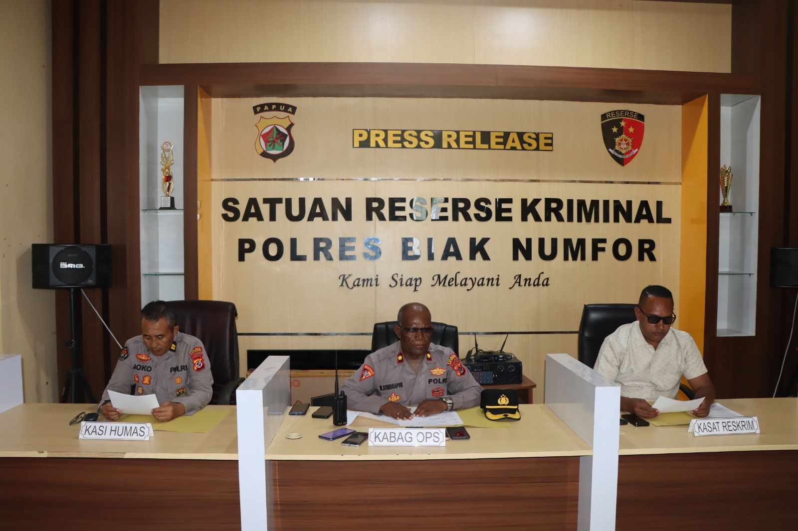 Kabag Ops Polres Biak Numfor Kompol Mika Rumbrapuk (Tengah) didampingi Kasat Reskrim Polres Biak Numfor Ipda. Daniel Rumpaidus (Kanan ) dan Kasi Humas Polres Biak Numfir Ipda Joko Susilo (Kiri), (Foto : Humas Polres Biak)