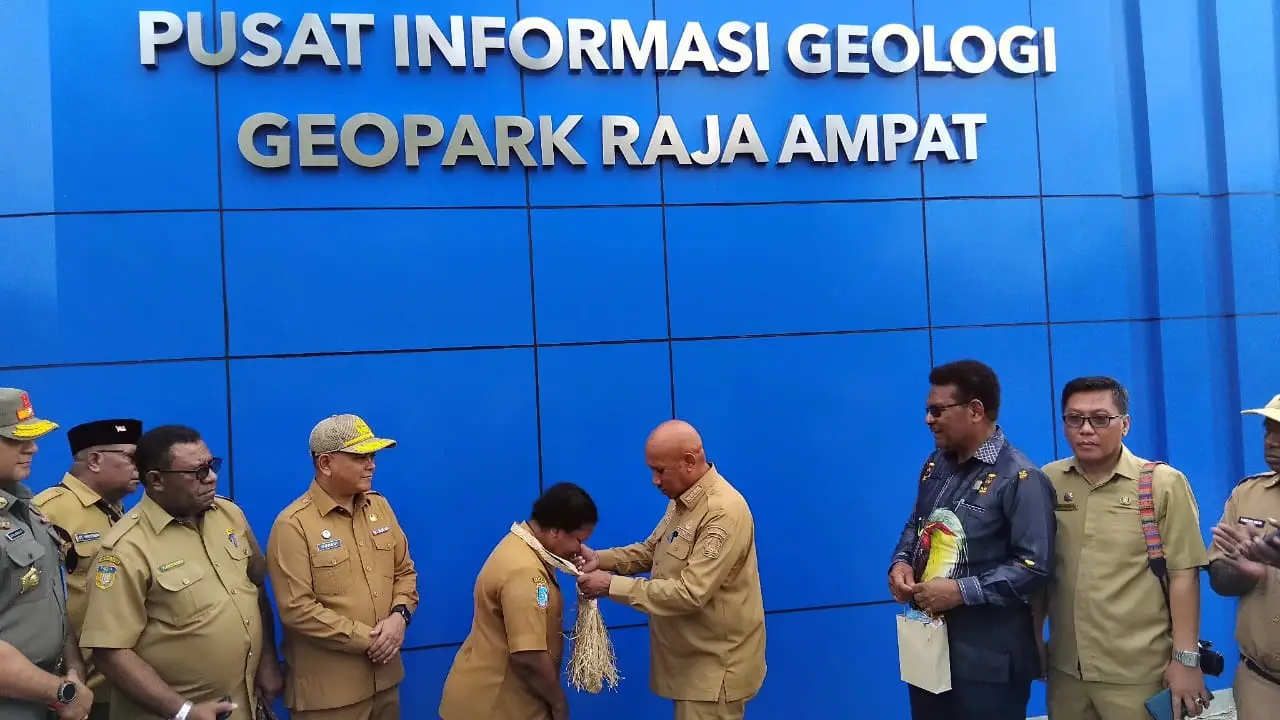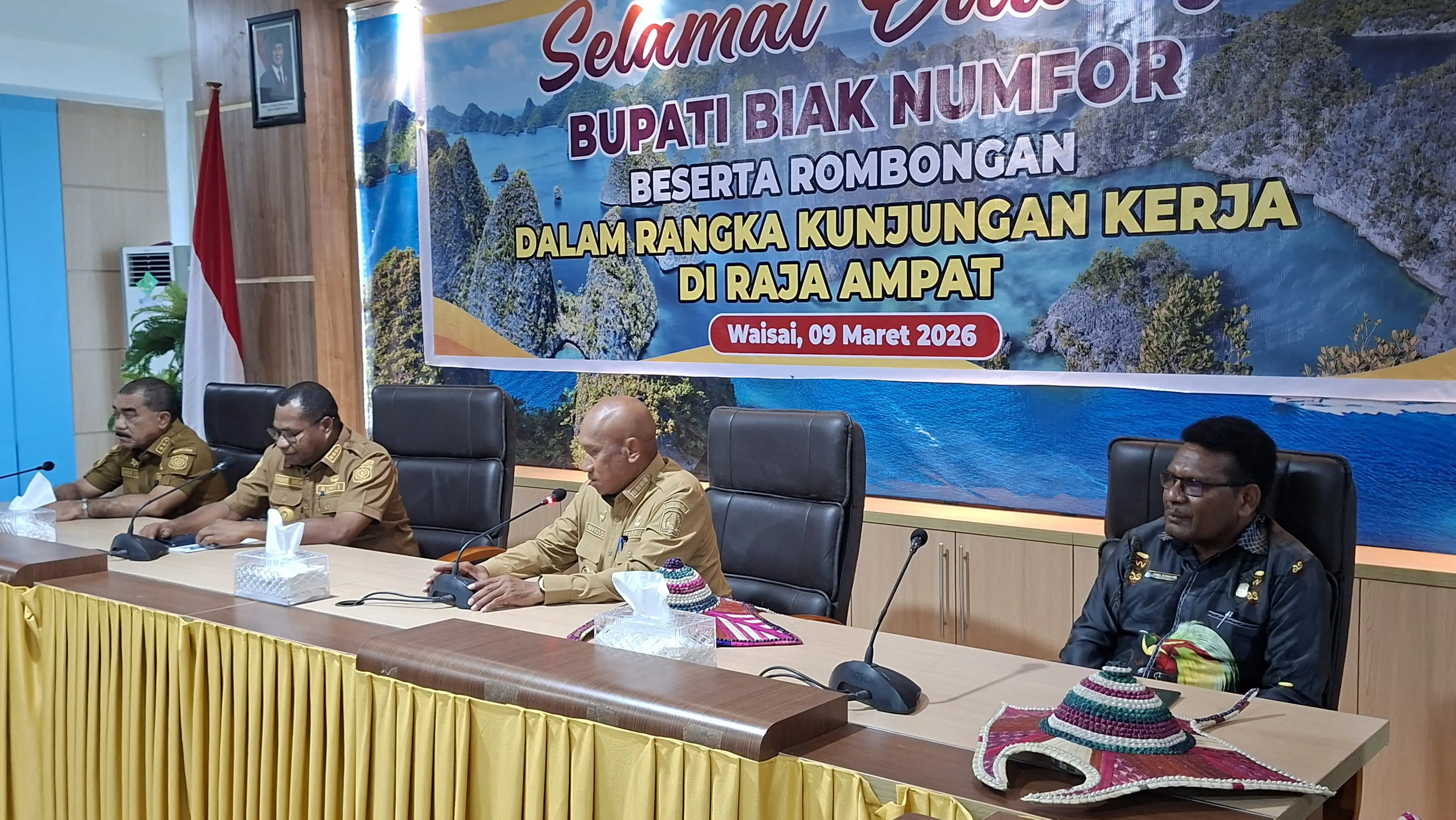 RRI. CO. ID. Biak - Bupati Raja Ampat Orideko Iriano Burdam dan Wakil Bupati Mansyur Syahdan menerima kunjungan kerja Bupati Biak Numfor Markus O Mansnembra dan rombongan di kantor Bupati Raja Ampat, Senin 9 Maret 2026 sekitar pukul 17.00 WIT. Rombongan Bupati Biak Numfor disambut tarian dan musik khas Raja Ampat dan prosesi Mansorandak serta pemasangan topi khas Raja Ampat.