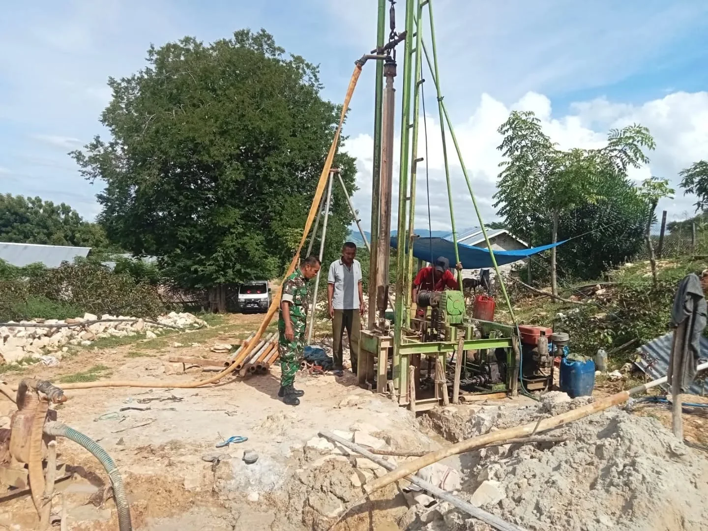 Babinsa Koramil 1625-05/Aesesa Serka Laudowik P. Hurek melakukan pemantauan pembangunan sumur bor tersebut, Rabu, 11 Maret 2026, untuk memastikan proses pekerjaan berjalan sesuai rencana.