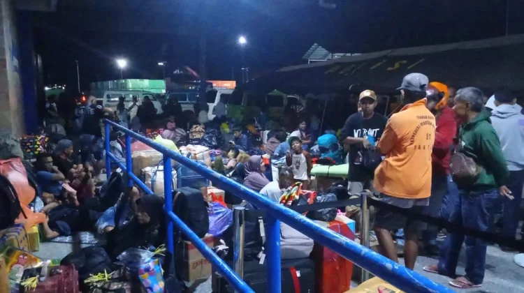 Para pemudik tampak membawa barang bawaan dalam jumlah cukup banyak sambil menunggu proses naik kapal. Kepadatan penumpang terlihat di sejumlah titik pelabuhan, namun proses keberangkatan tetap berjalan tertib dengan pengawasan petugas.