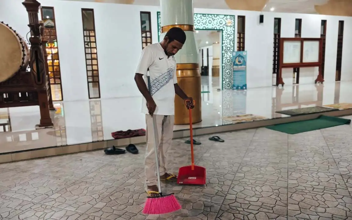 “Yang paling menonjol dibersihkan setiap malam adalah tempat wudu dan toilet karena digunakan oleh banyak jemaah,” ujarnya saat ditemui RRI pada Rabu malam, 11 Maret 2026.