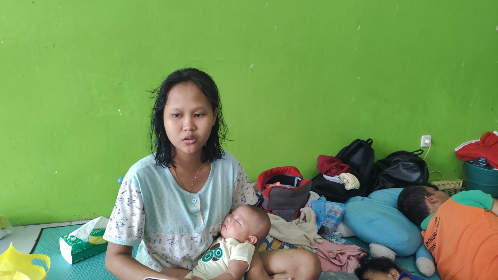 Menurut Vita, keputusan bertahan di posko diambil agar keluarga tidak terjebak saat air kembali meninggi. “Iya makanya pengen pulang, takut ya namanya cuacanya masih begini, apa lagi ada bayi, akunya takut,” ucap Vita sambil menimang buah hatinya yang terlelap.