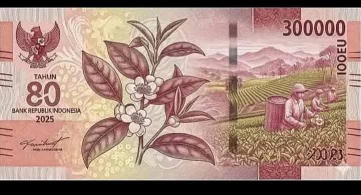 Dalam foto tersebut terlihat uang berwarna merah marun dengan gradasi kuning, menampilkan sosok pria berpeci di bagian depan, dilengkapi ornamen tanaman, serta ilustrasi perkebunan teh di sisi belakang. Unggahan itu bahkan diberi takarir: