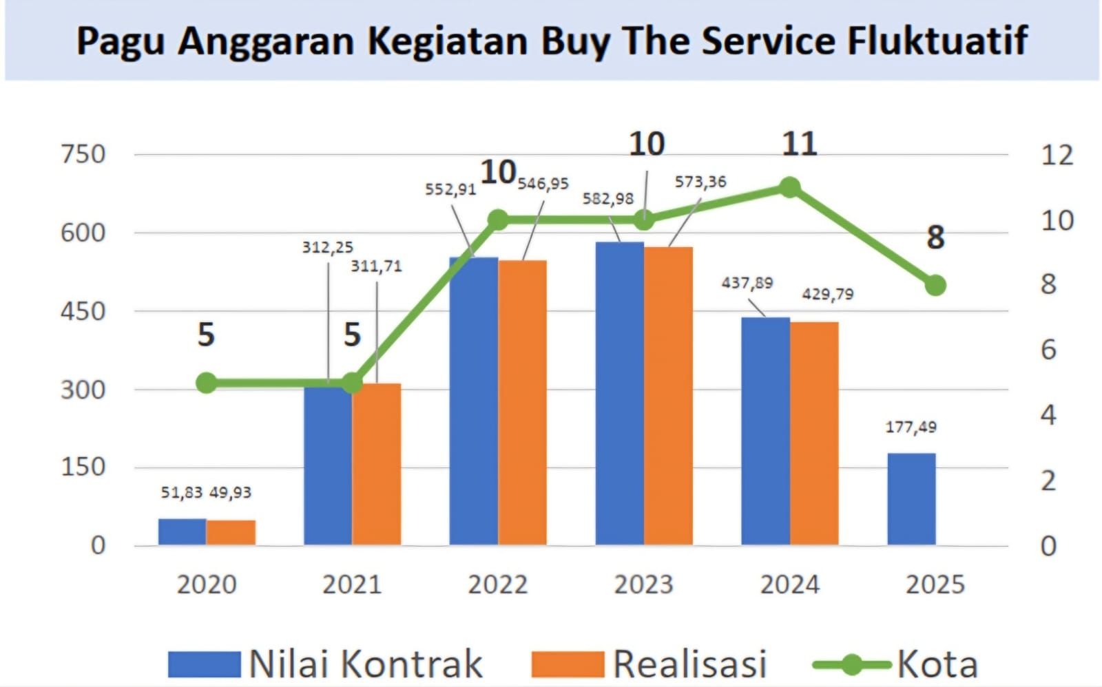 Data dari Ditjenhubdat (2025), menunjukkan pagu anggaran kegiatan buy the service (BTS) fluktuatif. Nilai kontrak tahun 2020 sebesar Rp 51,83 miliar, realisasi Rp 49,93 miliar, tahun 2021 (kontrak Rp 312,25 miliar, realisasi Rp 311,71 miliar), tahun 2022 (kontrak Rp 552,91 miliar, realisasi Rp 546,95 miliar), tahun 2023 (kontrak Rp 582,98 miliar, realisasi Rp 573,36 miliar), tahun 2024 (kontrak Rp 437,89 miliar, realisasi Rp 429,79 miliar) dan tahun 2024 kontrak Rp 177,49 miliar. Anggaran tahun 2025 dibandingkan tahun 2024, turun sekitar 60 persen.