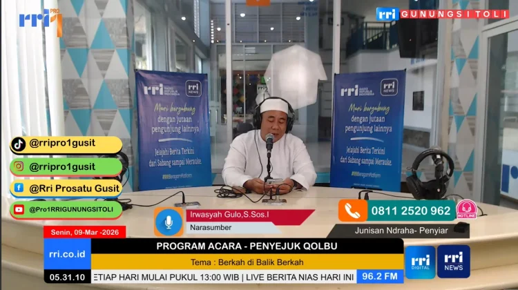 RRI.CO.ID, Gunungsitoli - Berkah di Balik Berkah menjadi topik Program Khusus Ramadhan Penyejuk Qolbu di studio programa 1 RRI Gunungsitoli Senin, 9 Maret 2026 menghadirkan narasumber Ustadz Irwansyah Gulo, S.Sos.I dan dipandu oleh Junisan Ndraha.