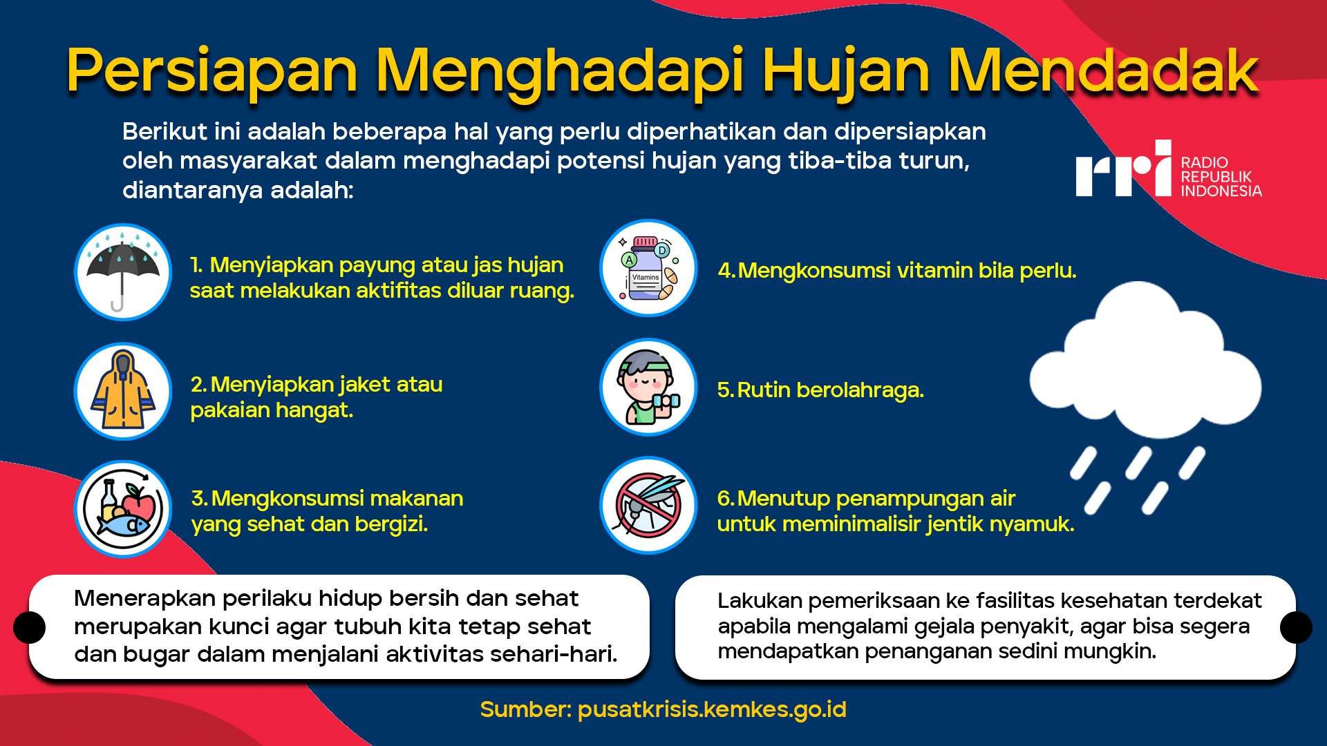 Dilansir dari pusatkrisis.kemkes.go.id, beberapa hal yang perlu diperhatikan antara lain menyiapkan payung atau jas hujan, jaket atau pakaian hangat, mengonsumsi makanan sehat dan bergizi, serta vitamin bila diperlukan. Selain itu, rutin berolahraga dan menutup penampungan air juga penting untuk mencegah berkembangnya jentik nyamuk.