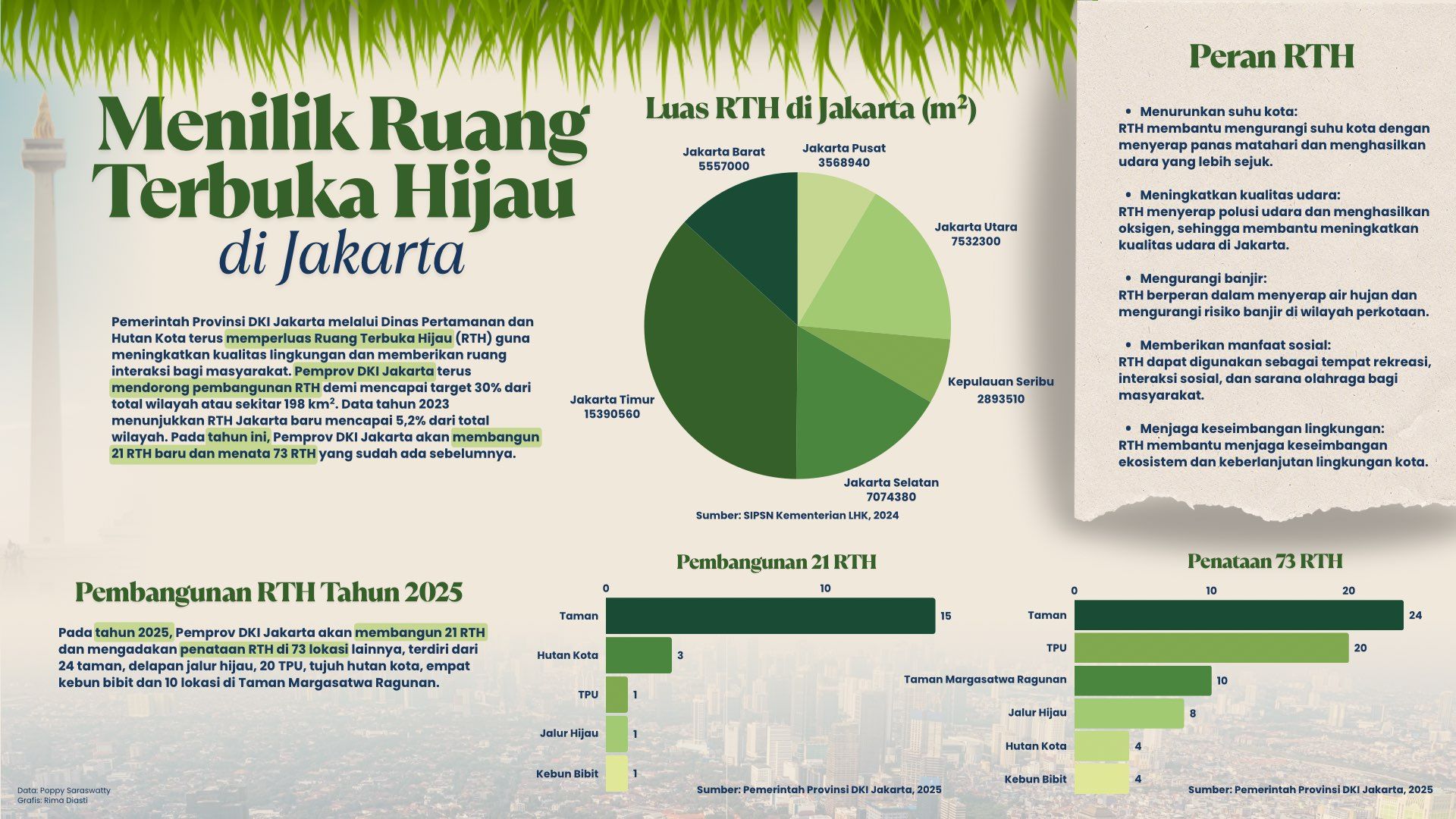 Data tahun 2023 menunjukkan RTH Jakarta baru mencapai 5,2 persen dari total luas wilayah. Target yang perlu dicapai sebesar 30 persen dari total luas wilayah