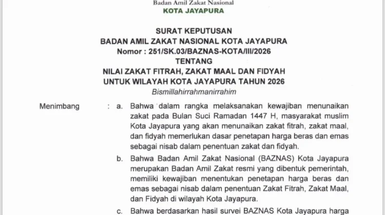 RRI.CO.ID, Jayapura - Badan Amil Zakat Nasional (Baznas) Kota Jayapura tertanggal 5 Maret 2026/ 15 Ramadhan 1447 H, mengeluarkan Surat Keputusan (SK) nomor 251/ baznas Kota/III/2026, tentang nilai Zakat Fitrah, Zakat Maal dan Fidyah untuk wilayah Kota Jayapura tahun 2026.