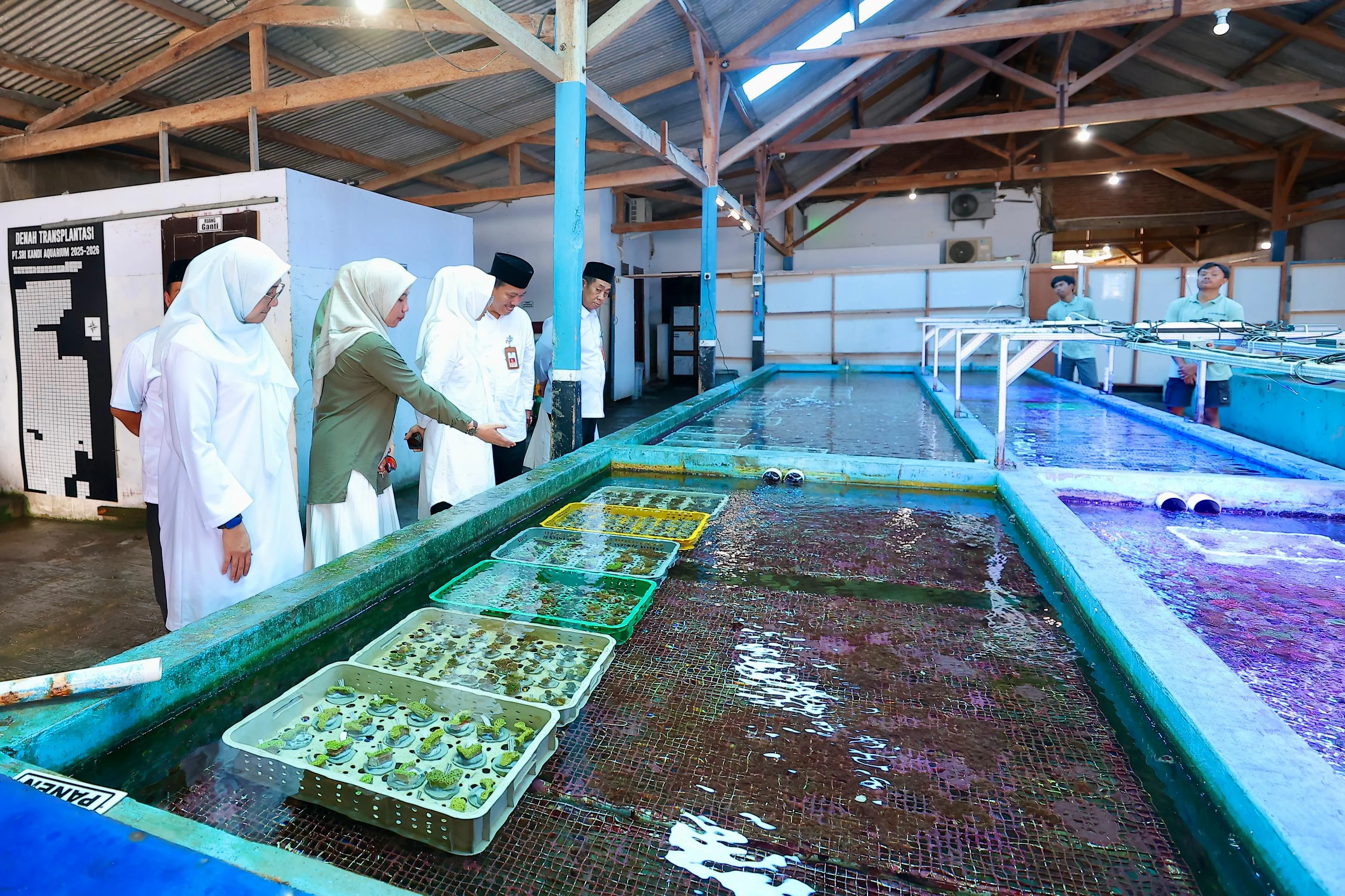 Sebelum dikirim ke luar negeri, koral yang telah dipanen didisplai dan disiapkan dalam 20 akuarium air laut. Masing-masing akuarium menampung sekitar 200 koral siap ekspor dan dilengkapi sistem sirkulasi air serta sinar Ultra Violet (UV) untuk menjaga kualitas.