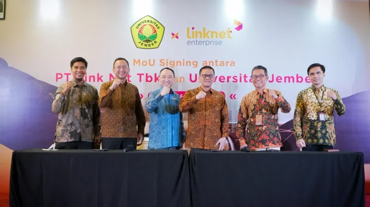 RRI.CO.ID, Jember- Dalam rangka mendukung penguatan infrastruktur digital sert pengembangan konsep Smart Campus berbasis Artificial Intelligence (Al), PT Link Net Tbk Linknet Enterprise, resmi menandatangani Nota Kesepahaman (MoU) dengan Universitas Jember (UNEJ).