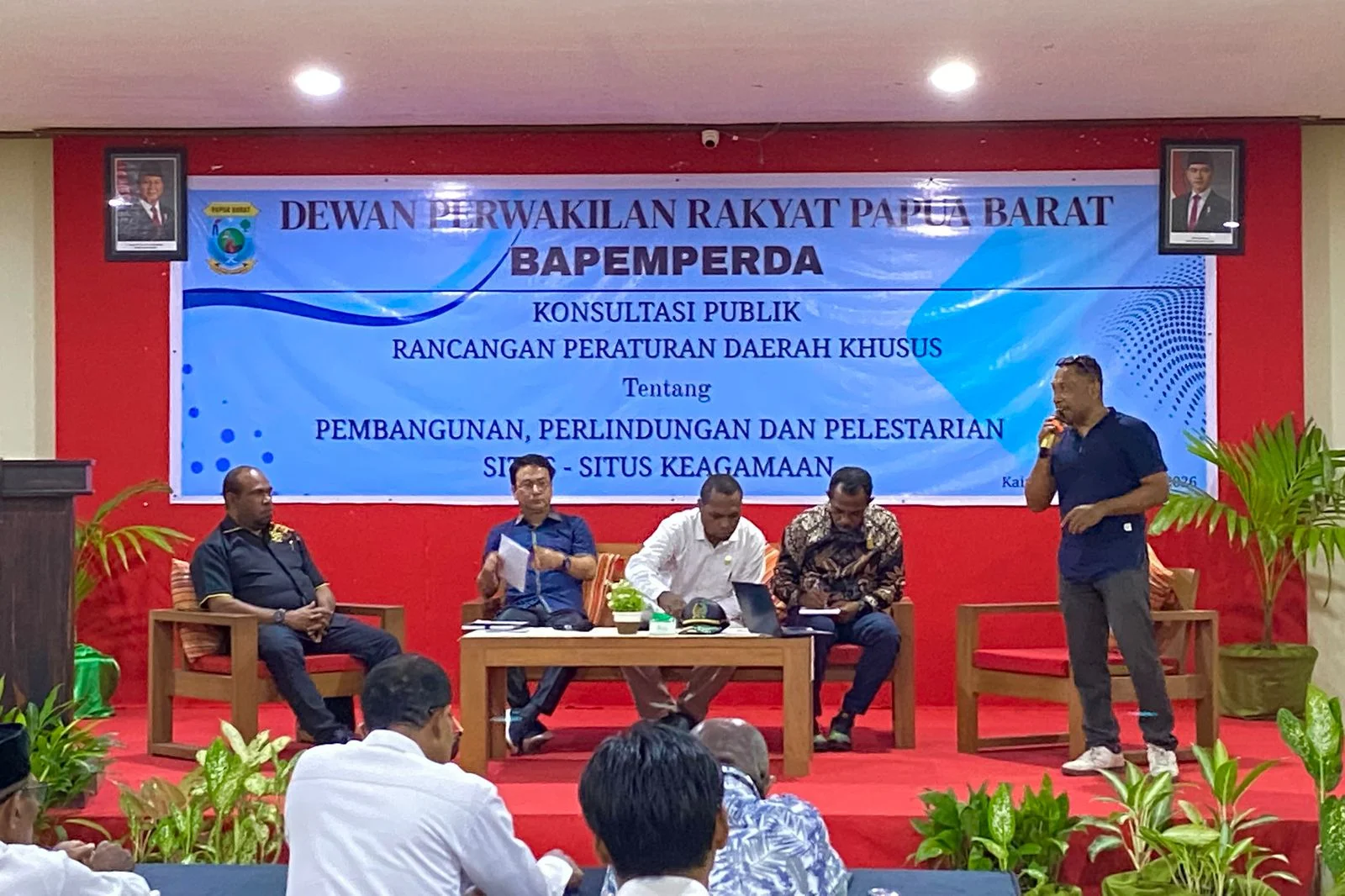 RRI.CO.ID, Kaimana - Badan Pembentukan Peraturan Daerah (Bapemperda) Dewan Perwakilan Rakyat (DPR) Papua Barat menggelar konsultasi publik di Hotel Grand Papua Kaimana, Jumat 6 maret 2026 lalu. Konsultasi publik tersebut membahas Rancangan Peraturan Daerah Khusus (Raperdasus) tentang Pembangunan, Perlindungan, dan Pelestarian Situs-Situs Keagamaan di Provinsi Papua Barat.