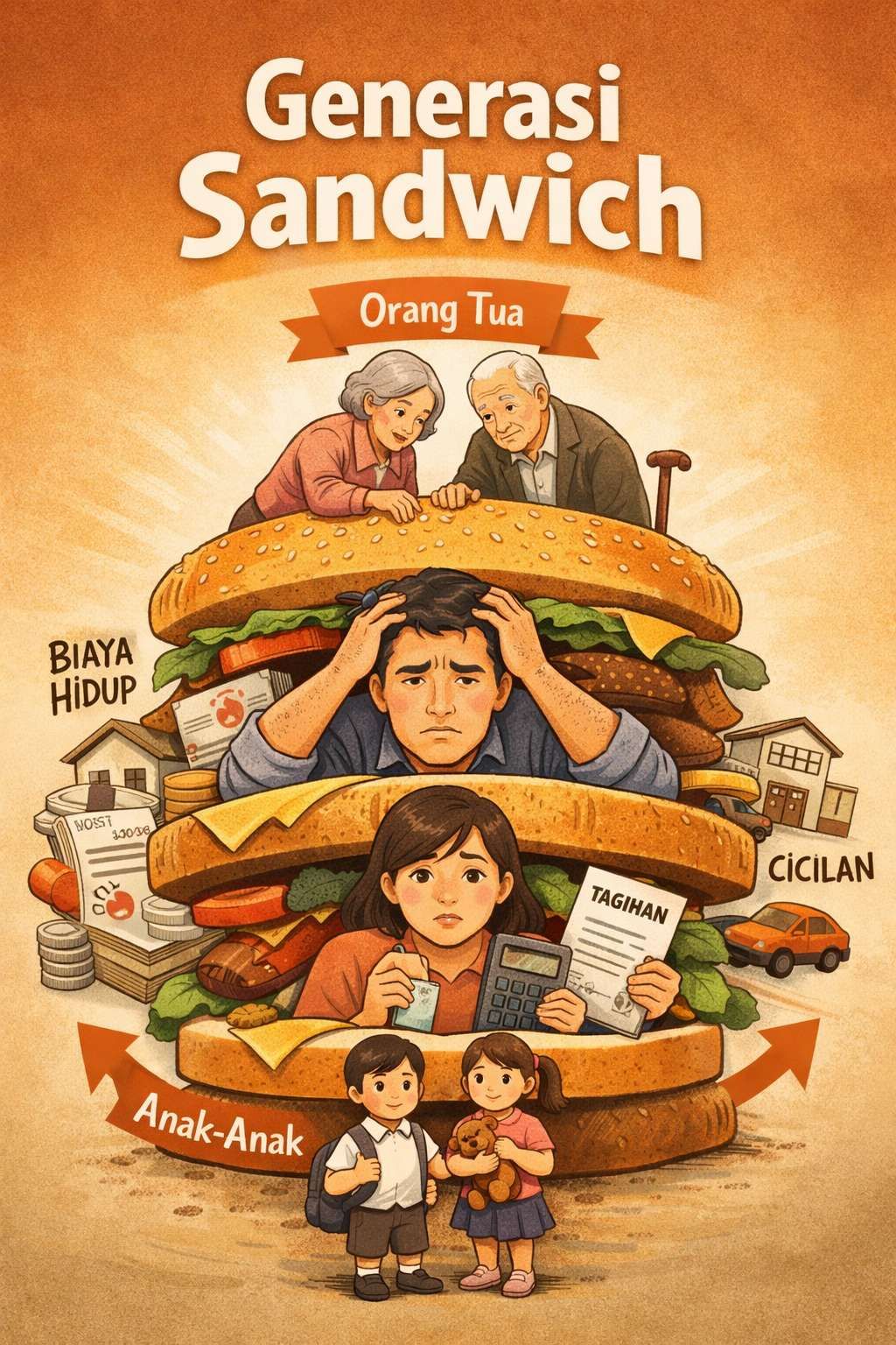 Kini, cerita tentang utang, cicilan, orang tua yang sakit, dan biaya pendidikan anak dibagikan secara terbuka. Dari sanalah muncul satu istilah yang terasa mewakili semuanya: generasi sandwich.
