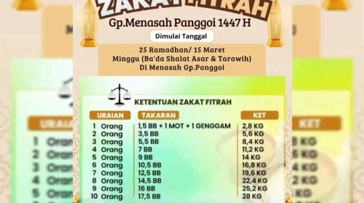 RRI.CO.ID, Lhokseumawe - Pemerintah Desa Gampong Menasah Panggoi, Lhokseumawe, secara resmi mengumumkan jadwal penerimaan Zakat Fitrah untuk tahun 1447 Hijriah. Berdasarkan informasi yang disosialisasikan, kegiatan ini akan dimulai pada tanggal 15 Maret 2026, yang bertepatan dengan 25 Ramadhan.