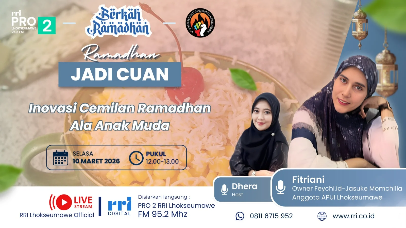 RRI.CO.ID Lhokseumawe – Bulan Ramadan tidak hanya menjadi momen meningkatkan ibadah, tetapi juga membuka peluang ekonomi bagi anak muda yang kreatif. Hal ini dibahas dalam program Berkah Ramadan bertajuk “Ramadan Jadi Cuan” yang disiarkan dari Studio Pro2, Selasa (10/03/2026). Dipandu Dhera, obrolan ini menghadirkan Fitriani, owner Feychi.id dan Jasuke Mamchilla, yang berbagi pengalaman tentang inovasi camilan kekinian yang diminati generasi muda saat Ramadan.