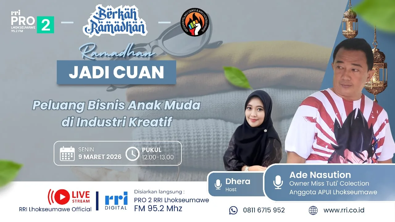 RRI.CO.ID Lhokseumawe — Industri kreatif terus membuka peluang usaha bagi anak muda, termasuk di bidang bisnis aksesori. Hal ini menjadi topik obrolan dalam program Berkah Ramadan bertajuk “Ramadan Jadi Cuan” yang disiarkan dari Studio Pro2 RRI Lhokseumawe, Senin (9/3/2026). Dalam dialog santai tersebut, host Dhera berbincang bersama Ade Nasution, owner Tuti Collection, yang membagikan pengalaman dan peluang bisnis aksesori di kalangan generasi muda.