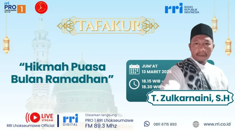 RRI.CO.ID,Lhokseumawe-Program tausiah jelang berbuka puasa bertajuk Tafakur yang diselengggarakan Pro Satu RRI Lhokseumawe bekerja sama dengan Kantor Kemenag Lhokseumawe edisi Jumat, 13 Maret 2026 menghadirkan penceramah Ustadz T. Zulkarnaini, S.H. Dalam ceramahnya Ustadz Zulkarnaini mengulas hikmah di balik pelaksanaan ibadah puasa bagi umat Islam.