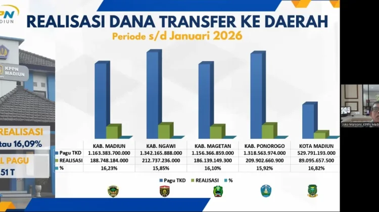 Joko menjelaskan, di wilayah KPPN Madiun pagu mengalami penurunan. “Realisasi TKD per Januari 2026, secara total kurang lebih sudah diangka Rp88 miliar dari pagu Rp5,51 triliun, atau dikisaran 16,06 persen,” ucap dia.