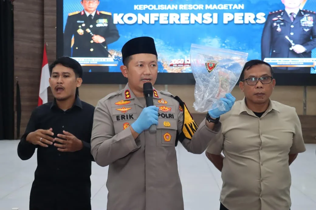RRI.CO.ID, Magetan : Polres Magetan mengamankan seorang pria yang diduga terlibat peredaran uang palsu. Kasus ini terungkap saat pengembangan perkara dugaan tindak pidana penggelapan dan disampaikan dalam konferensi pers oleh Kapolres Magetan AKBP Raden Erik Bangun Prakasa, Kamis (26/2/2026).