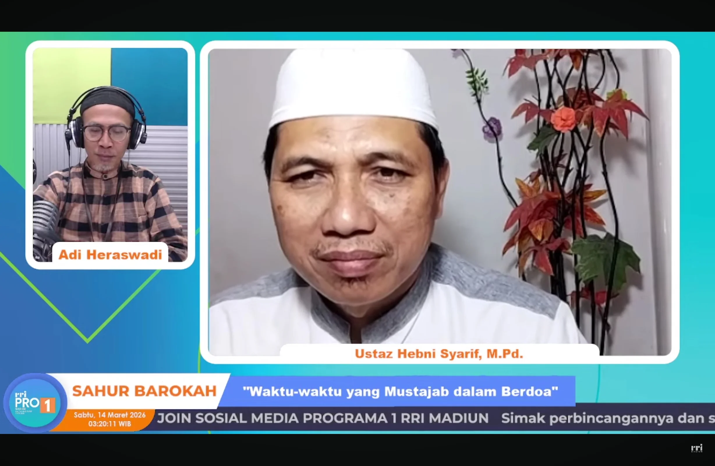 "Dan di antara ibadah yang bisa dilakukan orang beriman umat Rasulullah adalah ibadah lisan dengan mengaktifkan lisannya, yaitu doa," ujar Ustadz Heni Syarif. dalam siaran Sahur Barokah Pro 1 RRI Madiun. Sabtu, 14 Maret 2026 .