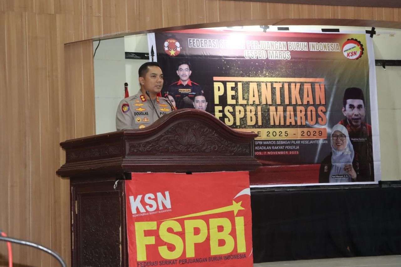 KBRN, Maros : Kapolres Maros AKBP Douglas Mahendrajaya menghadiri Pelantikan Pengurus Federasi Serikat Perjuangan Buruh Indonesia (FSPBI) Kabupaten Maros yang digelar di Gedung Baruga A Kantor Bupati Maros, Jumat (7/11/2025). Kehadiran Kapolres menjadi bentuk dukungan terhadap penguatan organisasi buruh di daerah.