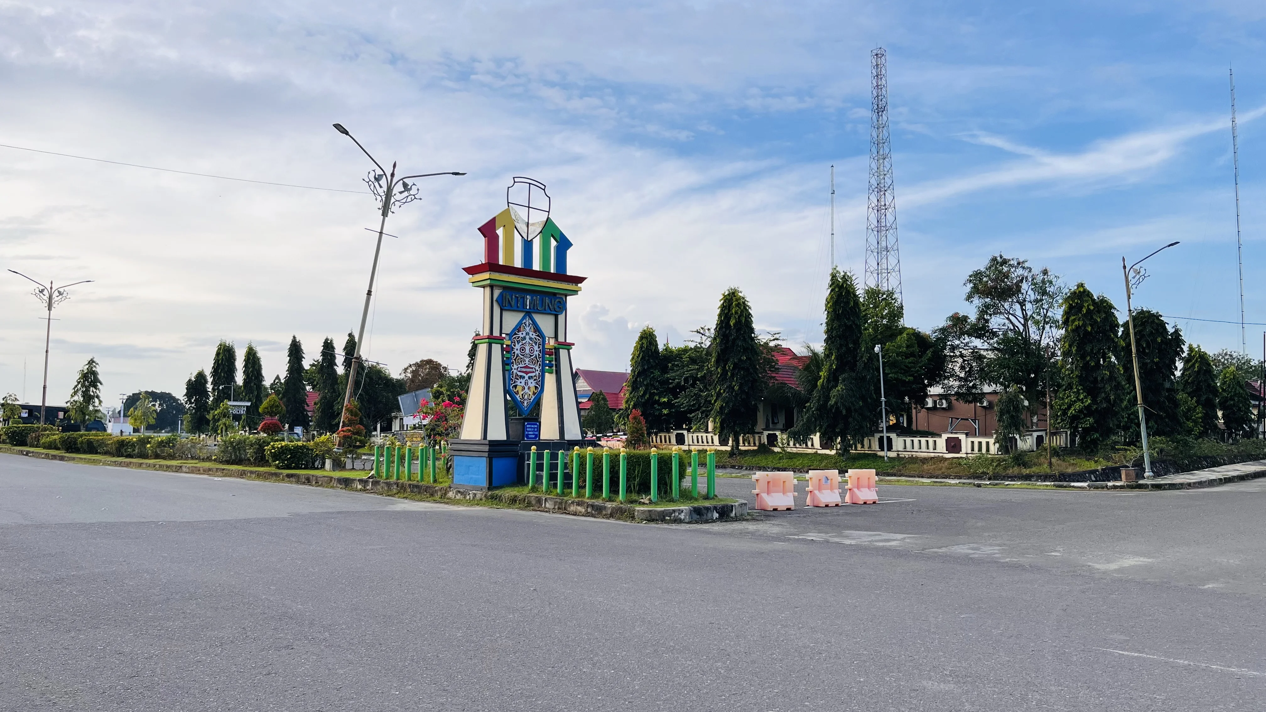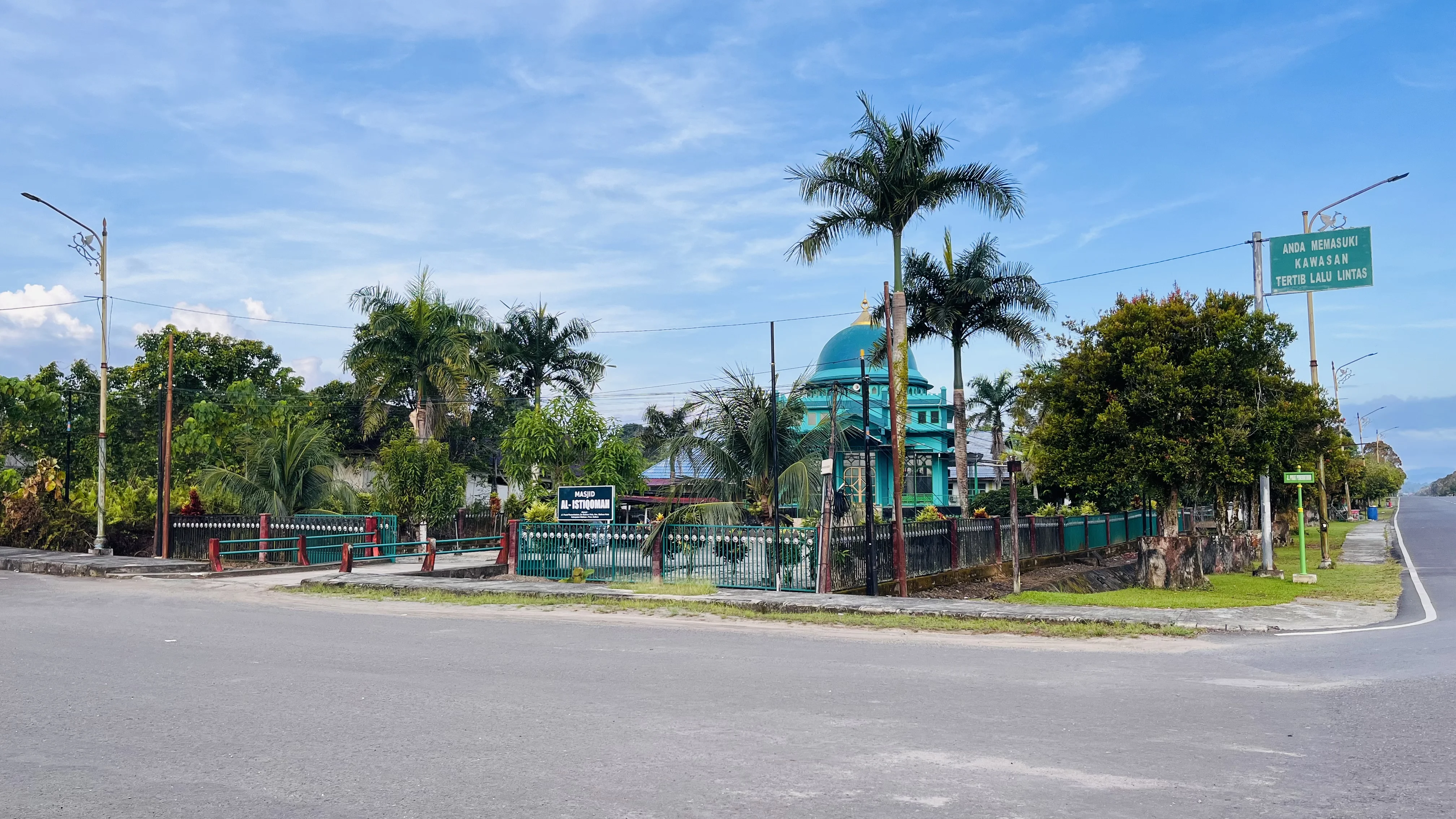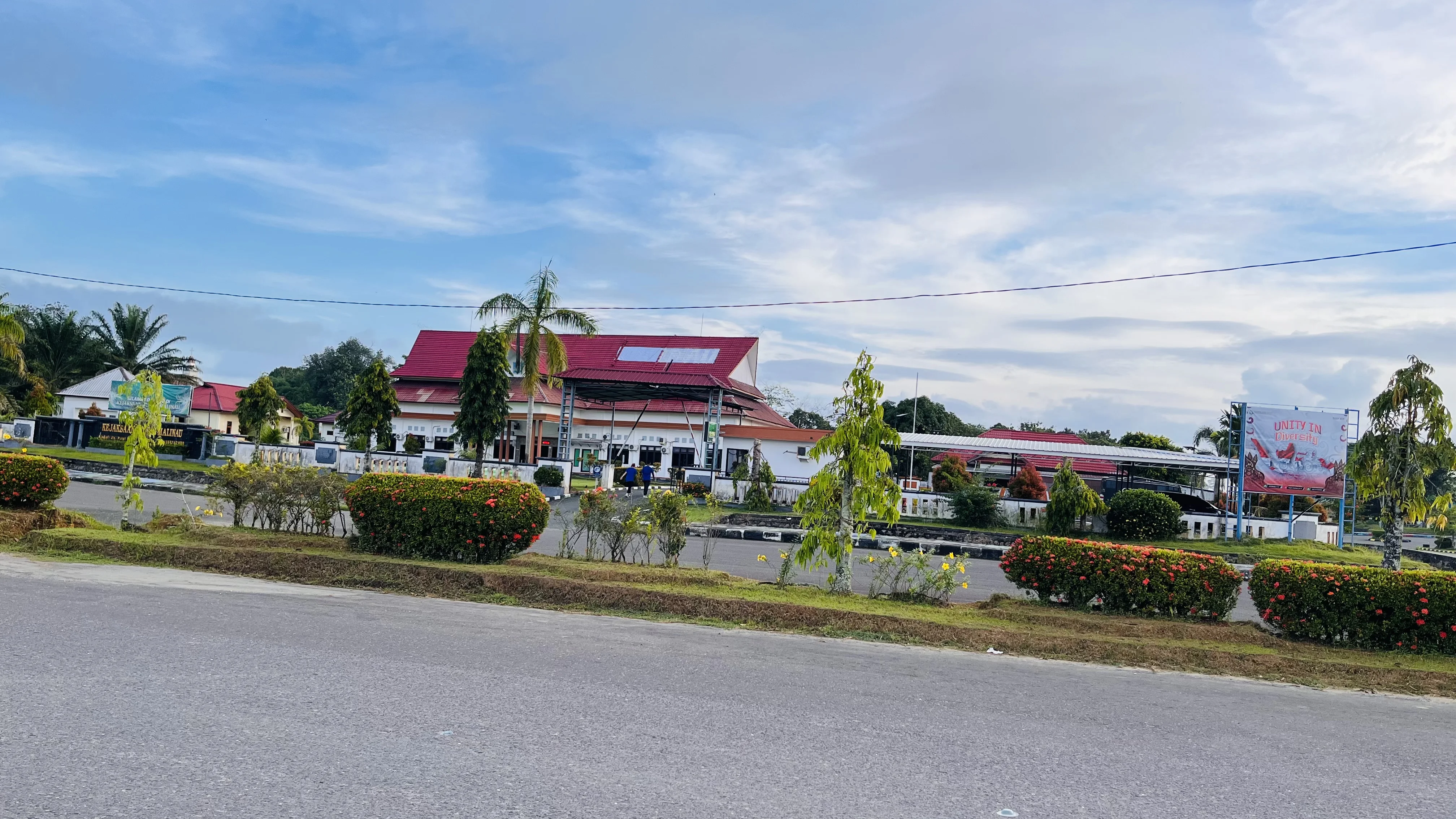 Kondisi ini menciptakan suasana tenang di sekitar kompleks perkantoran, dengan ruang terbuka dan jalan utama tampak luas tanpa kepadatan kendaraan. Lingkungan sekitar terlihat lebih sunyi dibandingkan hari kerja pada umumnya.